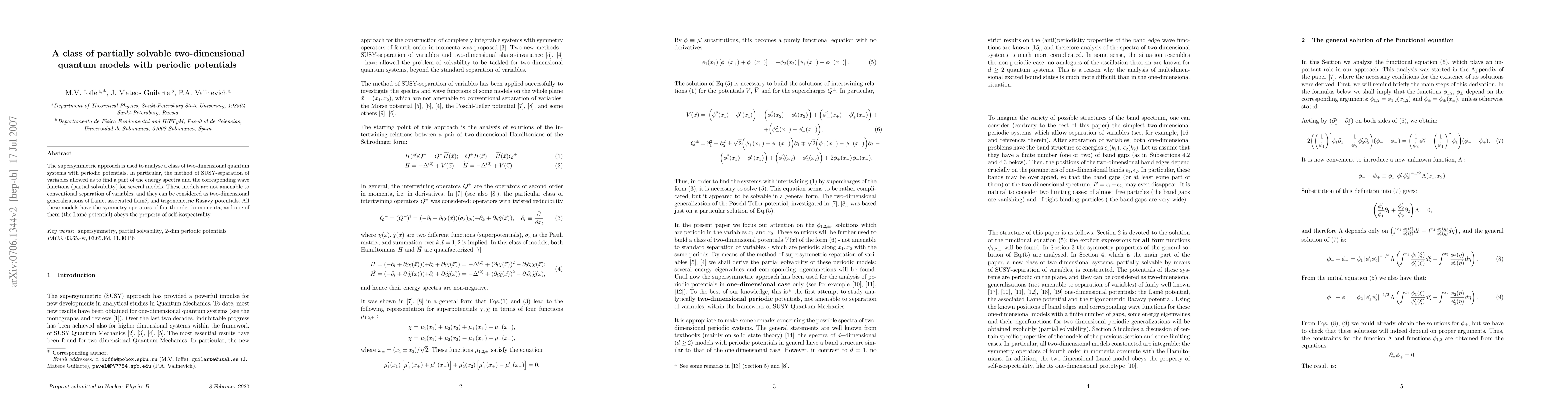 The supersymmetrical approach is used to analyse a class of two-dimensional quantum systems with periodic potentials. In particular, the method of SUSY-separation of variables allowed us to find a part of the energy spectra and the corresponding wave functions (partial solvability) for several models. These models are not amenable to conventional separation of variables, and they can be considered as two-dimensional generalizations of Lame, associated Lame, and trigonometric Razavy potentials. All these models have the symmetry operators of fourth order in momenta, and one of them (the Lame potential) obeys the property of self-isospectrality.