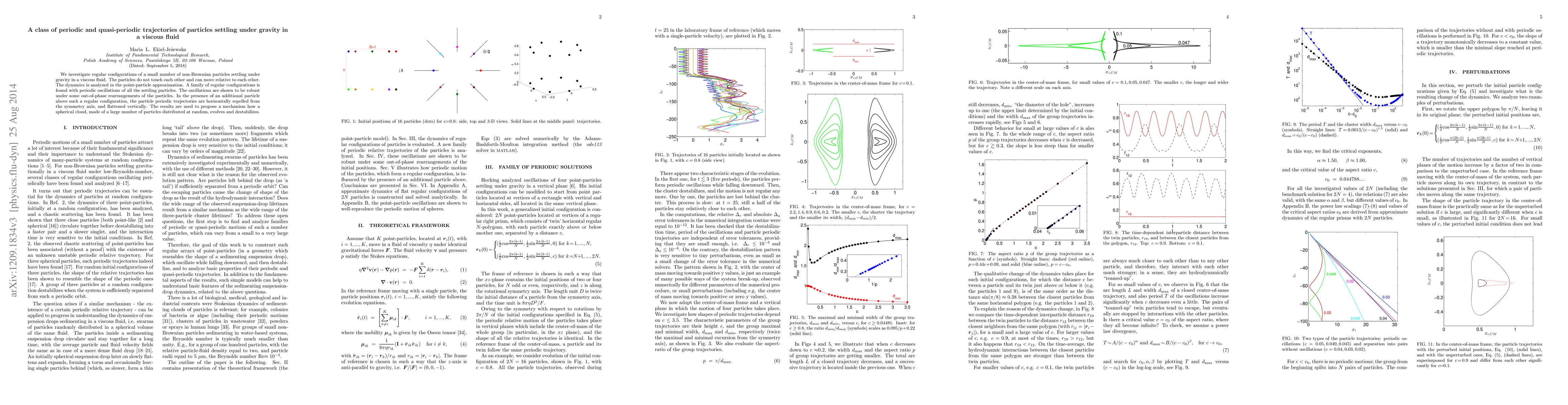 This paper explores the periodic and quasi-periodic trajectories of non-touching particles settling under gravity in a viscous fluid, revealing robust periodic oscillations and their deformation when an additional particle is introduced. The findings suggest a mechanism for the evolution and destabilization of a spherical cloud of randomly distributed particles.