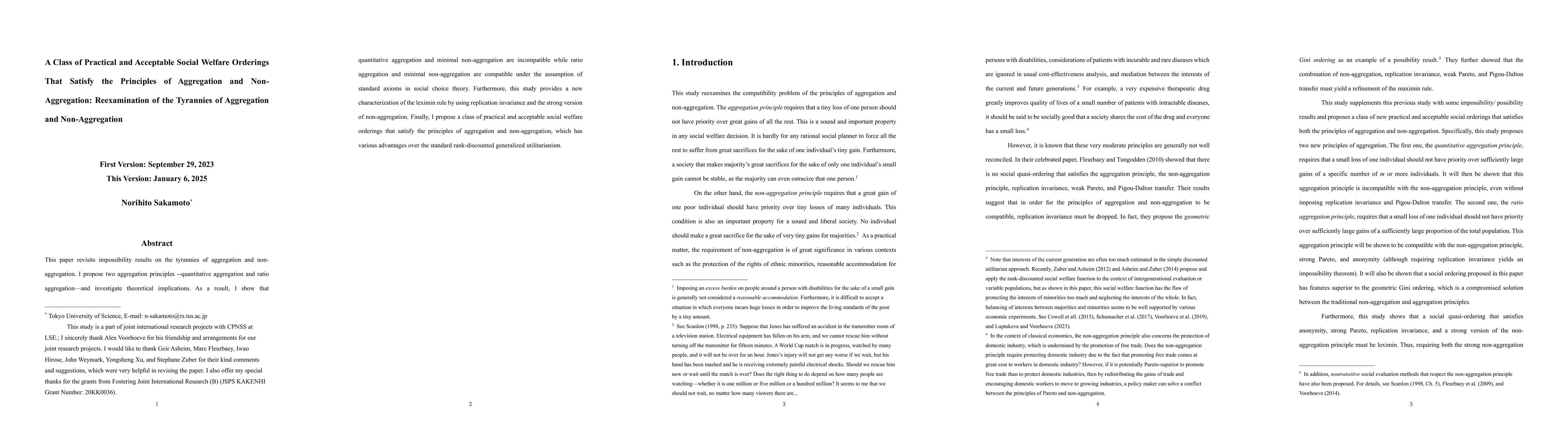 This paper revisits impossibility results on the tyrannies of aggregation and non-aggregation. I propose two aggregation principles (quantitative aggregation and ratio aggregation) and investigate theoretical implications. As a result, I show that quantitative aggregation and minimal non-aggregation are incompatible while ratio aggregation and minimal non-aggregation are compatible under the assumption of standard axioms in social choice theory. Furthermore, this study provides a new characterization of the leximin rule by using replication invariance and the strong version of non-aggregation. Finally, I propose a class of practical and acceptable social welfare orderings that satisfy the principles of aggregation and non-aggregation, which has various advantages over the standard rank-discounted generalized utilitarianism.