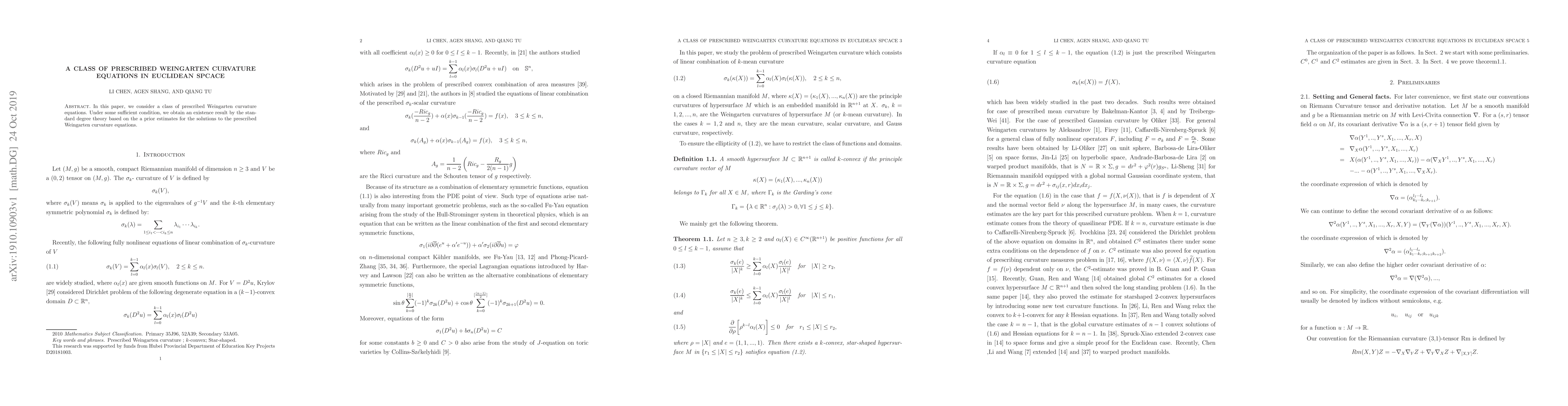 This paper investigates a class of prescribed Weingarten curvature equations and proves the existence of solutions under certain conditions using degree theory and a priori estimates.