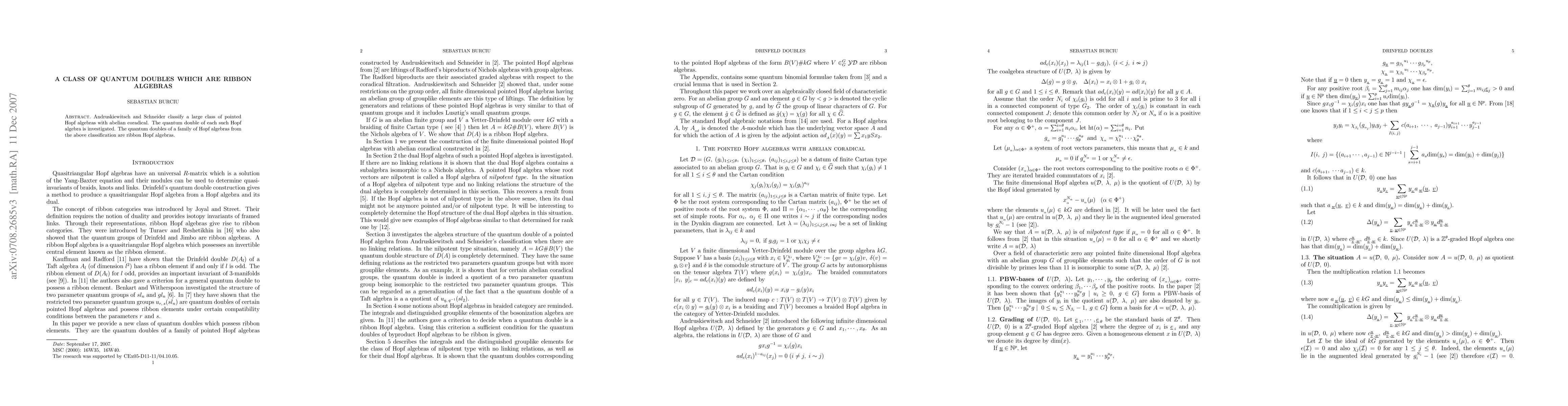 Summary: Andruskiewitsch and Schneider classify pointed Hopf algebras with abelian coradicals, demonstrating that the quantum doubles of a specific family within this classification are ribbon Hopf algebras. This work highlights the structural properties linking these Hopf algebras to ribbon algebraic theory.