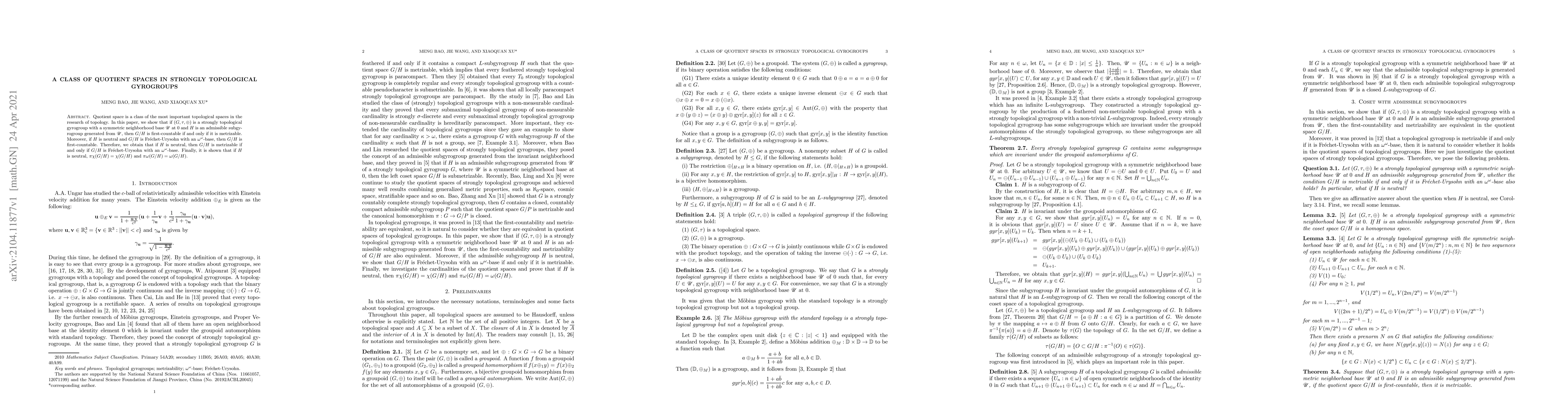 This paper investigates quotient spaces in strongly topological gyrogroups, proving that if G is such a gyrogroup with a symmetric neighborhood base U at 0, and H is an admissible subgyrogroup generated from U, then G/H is first-countable if and only if it is metrizable. It also establishes that if H is neutral and G/H is Frechet-Urysohn with an ωω-base, then G/H is metrizable.