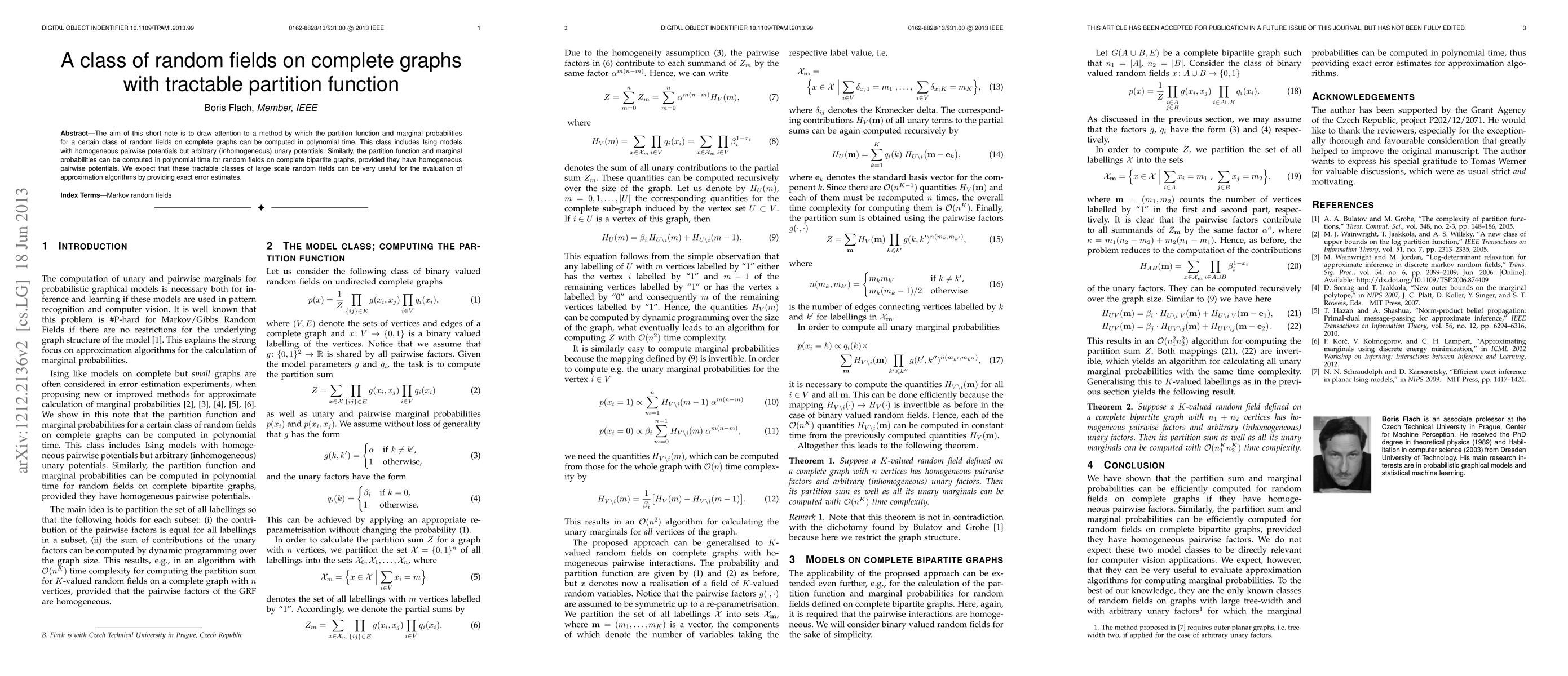 The aim of this short note is to draw attention to a method by which the partition function and marginal probabilities for a certain class of random fields on complete graphs can be computed in polynomial time. This class includes Ising models with homogeneous pairwise potentials but arbitrary (inhomogeneous) unary potentials. Similarly, the partition function and marginal probabilities can be computed in polynomial time for random fields on complete bipartite graphs, provided they have homogeneous pairwise potentials. We expect that these tractable classes of large scale random fields can be very useful for the evaluation of approximation algorithms by providing exact error estimates.