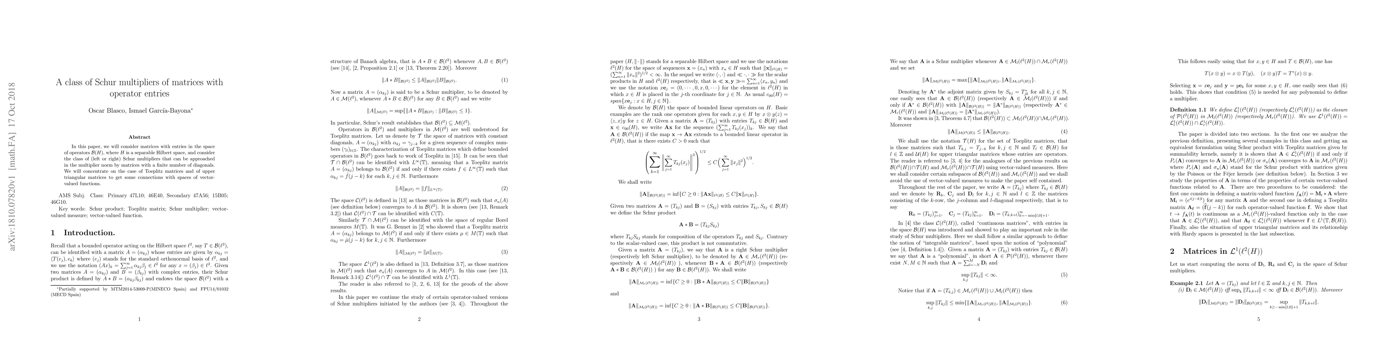 This paper explores matrices with operator entries in $\mathcal{B}(H)$ and investigates the class of Schur multipliers that can be approximated by matrices with a finite number of diagonals, focusing on Toeplitz and upper triangular matrices to establish connections with vector-valued function spaces.