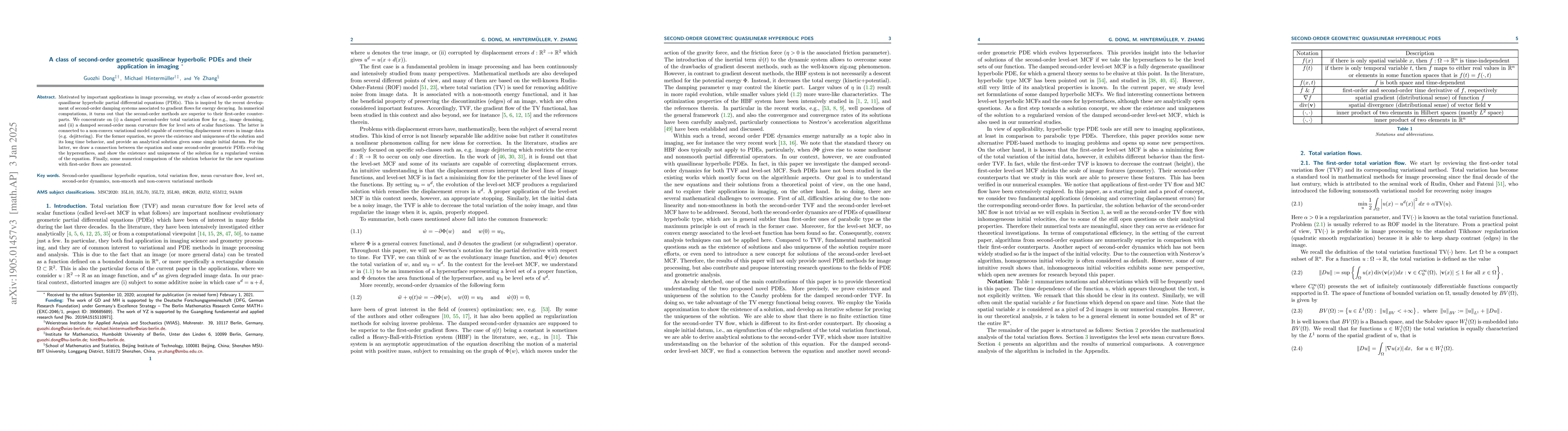 In this paper, we study damped second-order dynamics, which are quasilinear hyperbolic partial differential equations (PDEs). This is inspired by the recent development of second-order damping systems for accelerating energy decay of gradient flows. We concentrate on two equations: one is a damped second-order total variation flow, which is primarily motivated by the application of image denoising; the other is a damped second-order mean curvature flow for level sets of scalar functions, which is related to a non-convex variational model capable of correcting displacement errors in image data (e.g. dejittering). For the former equation, we prove the existence and uniqueness of the solution. For the latter, we draw a connection between the equation and some second-order geometric PDEs evolving the hypersurfaces which are described by level sets of scalar functions, and show the existence and uniqueness of the solution for a regularized version of the equation. The latter is used in our algorithmic development. A general algorithm for numerical discretization of the two nonlinear PDEs is proposed and analyzed. Its efficiency is demonstrated by various numerical examples, where simulations on the behavior of solutions of the new equations and comparisons with first-order flows are also documented.