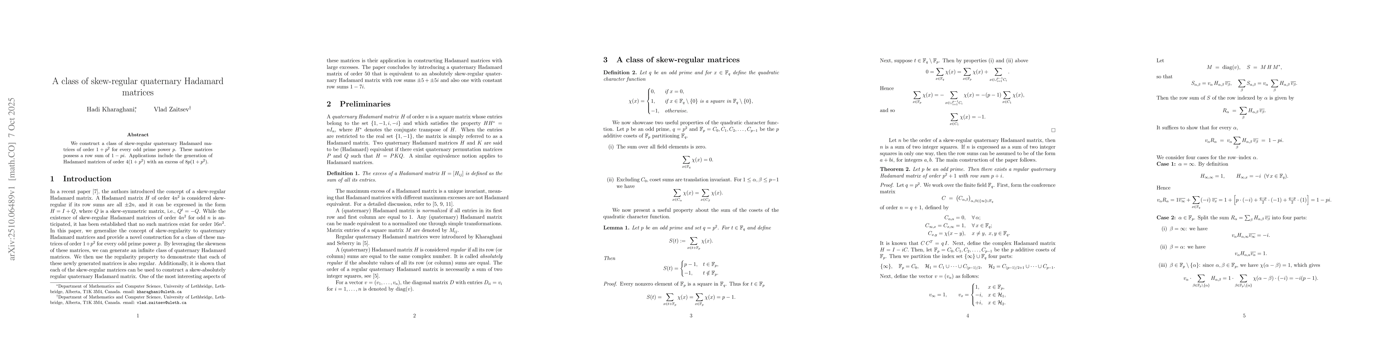 The research employs a combination of algebraic techniques and combinatorial analysis to construct quaternary Hadamard matrices with specific row sum properties. It utilizes diagonal transformations and matrix multiplication to achieve the desired skew-regular structures.