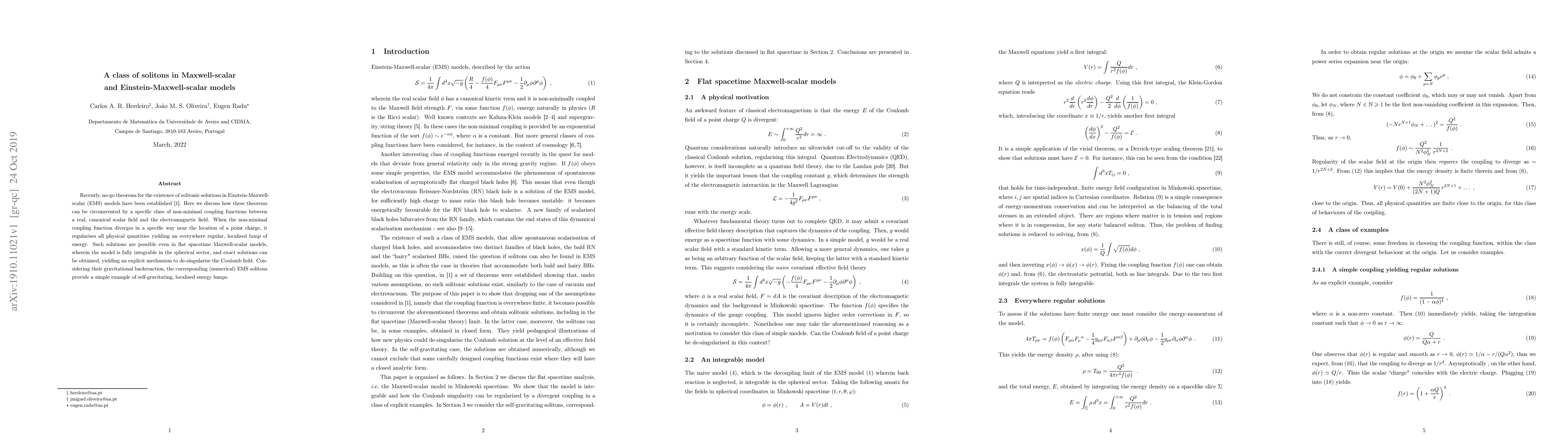 This paper explores solitonic solutions in Einstein-Maxwell-scalar models, demonstrating how specific non-minimal coupling functions can bypass established no-go theorems. These solutions, regularised near point charges, yield localised energy lumps even in flat spacetime, with exact solutions providing a mechanism to de-singularise the Coulomb field.