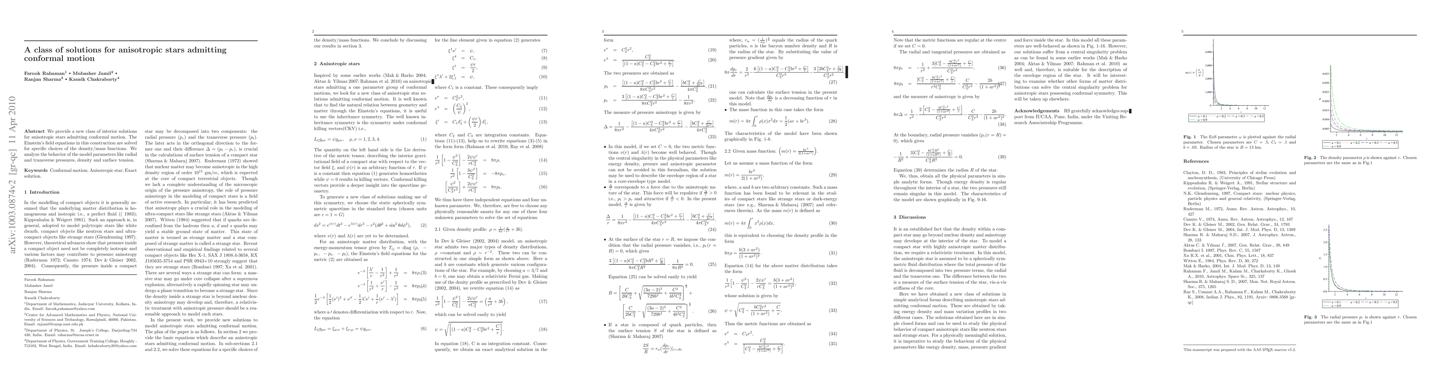 This paper introduces a novel class of interior solutions for anisotropic stars that allow conformal motion, solving Einstein's field equations for specific density/mass functions and analyzing the behavior of radial and transverse pressures, density, and surface tension.