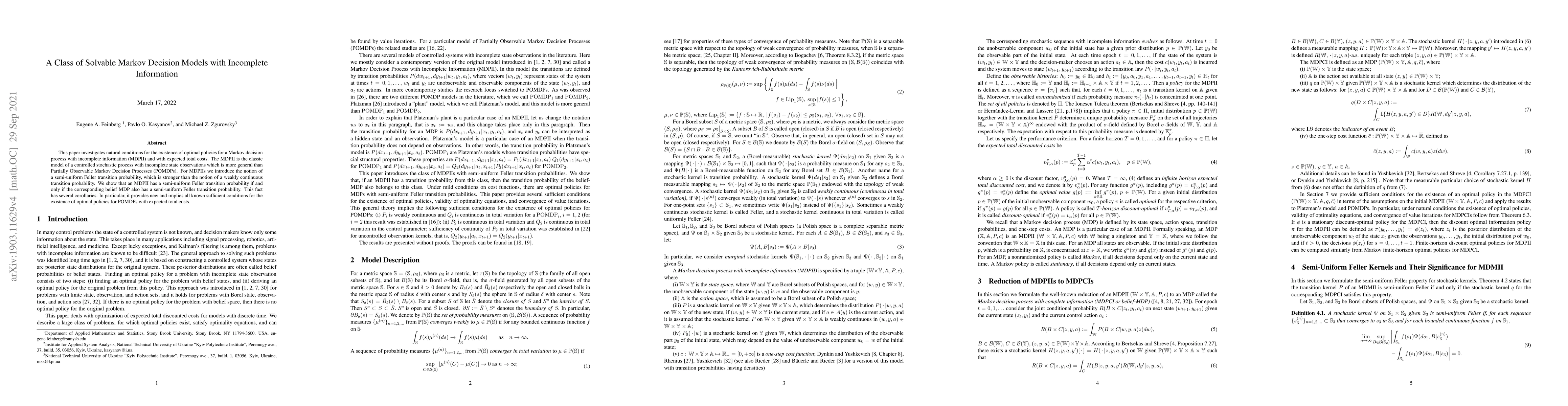 This paper explores conditions for optimal policy existence in Markov Decision Processes with Incomplete Information (MDPII), introducing a semi-uniform Feller transition probability. It establishes that MDPII and its belief MDP share this property, providing new sufficient conditions for optimal policy existence in POMDPs.