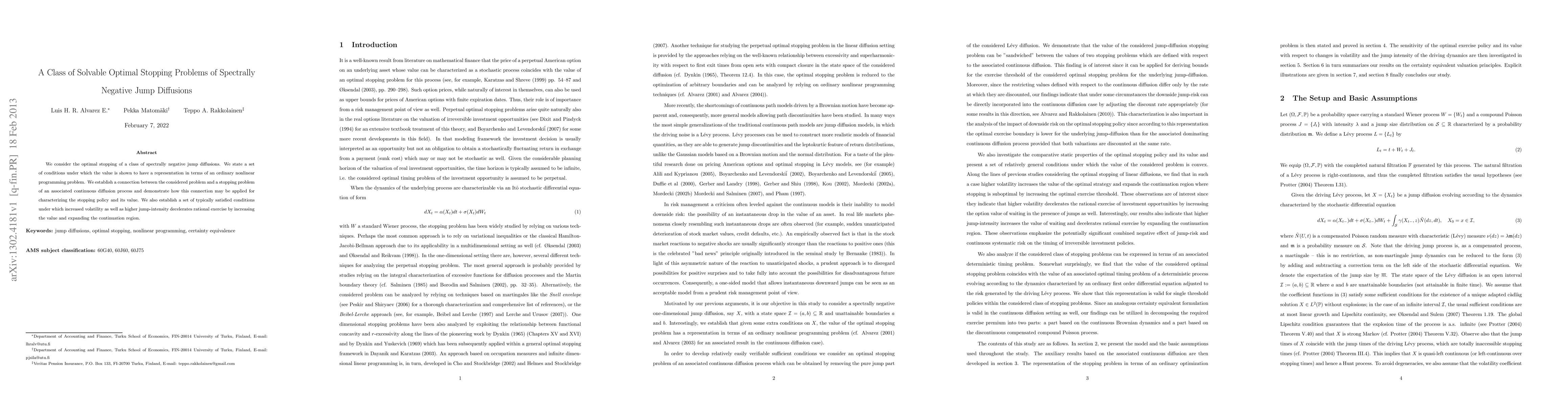We consider the optimal stopping of a class of spectrally negative jump diffusions. We state a set of conditions under which the value is shown to have a representation in terms of an ordinary nonlinear programming problem. We establish a connection between the considered problem and a stopping problem of an associated continuous diffusion process and demonstrate how this connection may be applied for characterizing the stopping policy and its value. We also establish a set of typically satisfied conditions under which increased volatility as well as higher jump-intensity decelerates rational exercise by increasing the value and expanding the continuation region.