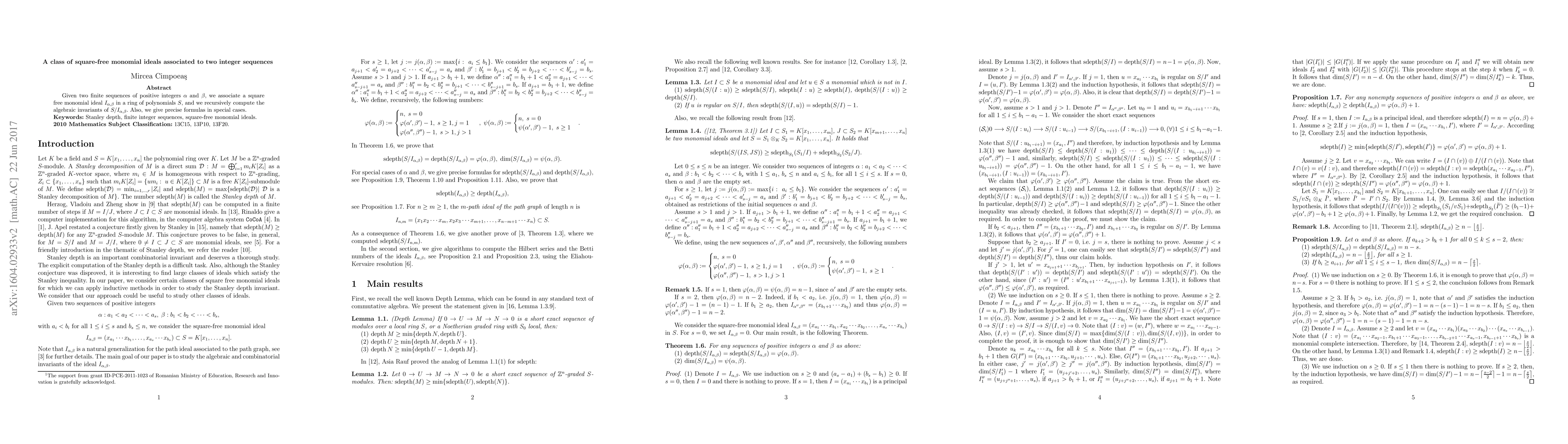 Given two finite sequences of positive integers $\alpha$ and $\beta$, we associate a square free monomial ideal $I_{\alpha,\beta}$ in a ring of polynomials $S$, and we recursively compute the algebraic invariants of $S/I_{\alpha,\beta}$. Also, we give precise formulas in special cases.