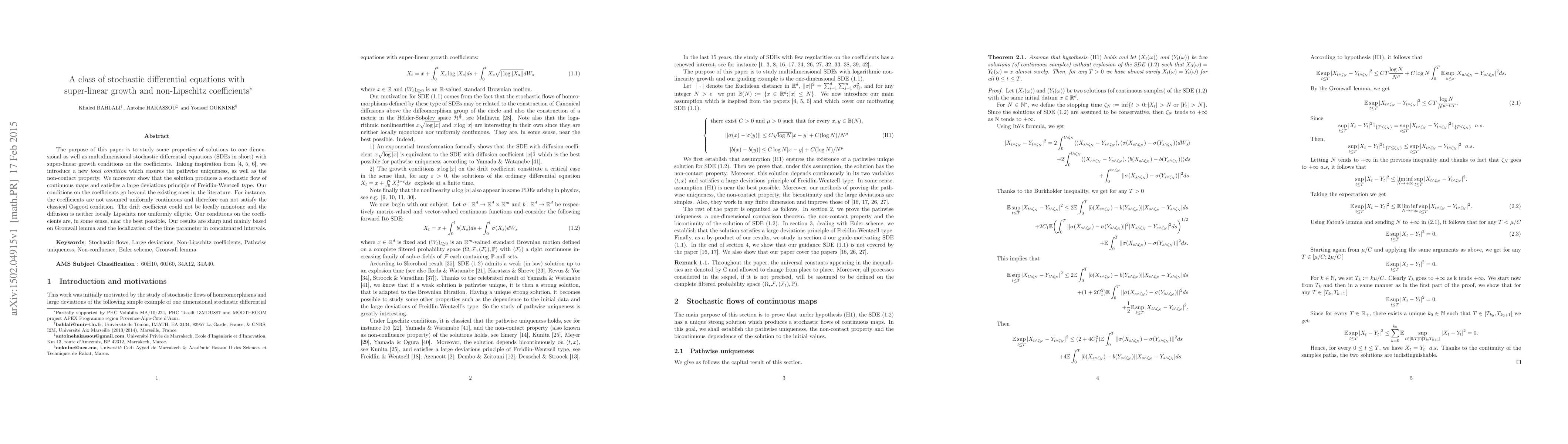 The purpose of this paper is to study some properties of solutions to one dimensional as well as multidimensional stochastic differential equations (SDEs in short) with super-linear growth conditions on the coefficients. Taking inspiration from \cite{BEHP, KBahlali, Bahlali}, we introduce a new {\it{local condition}} which ensures the pathwise uniqueness, as well as the non-contact property. We moreover show that the solution produces a stochastic flow of continuous maps and satisfies a large deviations principle of Freidlin-Wentzell type. Our conditions on the coefficients go beyond the existing ones in the literature. For instance, the coefficients are not assumed uniformly continuous and therefore can not satisfy the classical Osgood condition. The drift coefficient could not be locally monotone and the diffusion is neither locally Lipschitz nor uniformly elliptic. Our conditions on the coefficients are, in some sense, near the best possible. Our results are sharp and mainly based on Gronwall lemma and the localization of the time parameter in concatenated intervals