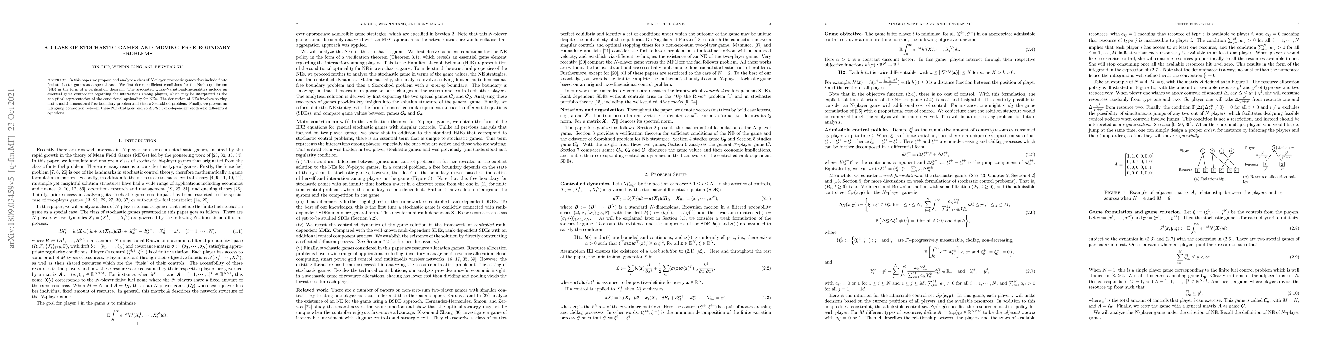 In this paper we propose and analyze a class of $N$-player stochastic games that include finite fuel stochastic games as a special case. We first derive sufficient conditions for the Nash equilibrium (NE) in the form of a verification theorem. The associated Quasi-Variational-Inequalities include an essential game component regarding the interactions among players, which may be interpreted as the analytical representation of the conditional optimality for NEs. The derivation of NEs involves solving first a multi-dimensional free boundary problem and then a Skorokhod problem. We call it a "moving free boundary" to highlight the difference between standard control problems and stochastic games. Finally, we present an intriguing connection between these NE strategies and controlled rank-dependent stochastic differential equations.