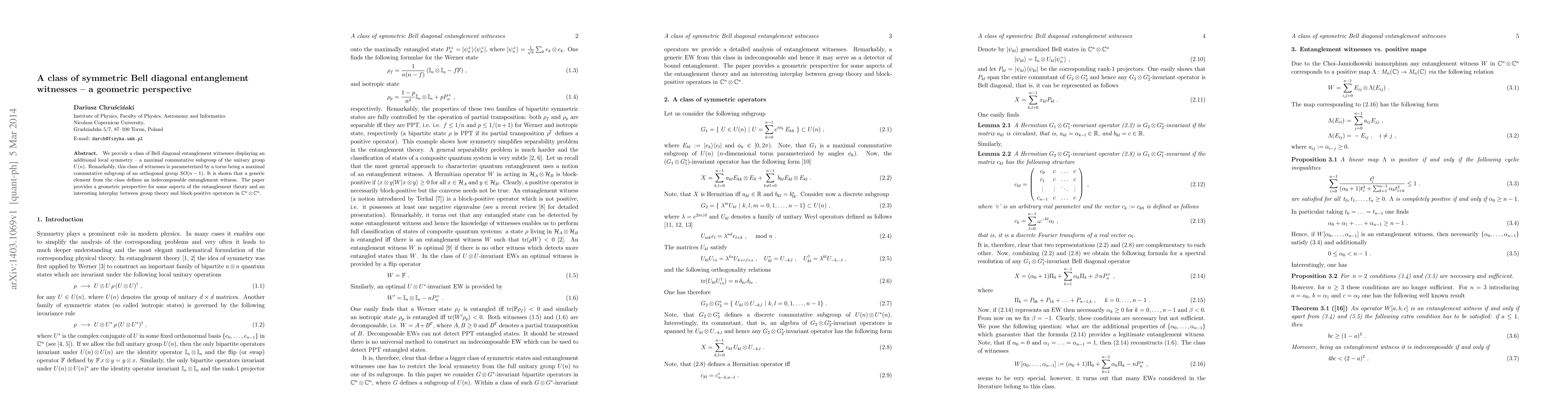 This paper introduces a class of symmetric Bell diagonal entanglement witnesses characterized by a maximal commutative subgroup of U(n), parameterized by a torus in SO(n-1), and demonstrates their indecomposable nature, offering a geometric perspective on entanglement theory. The study highlights the interplay between group theory and block-positive operators.