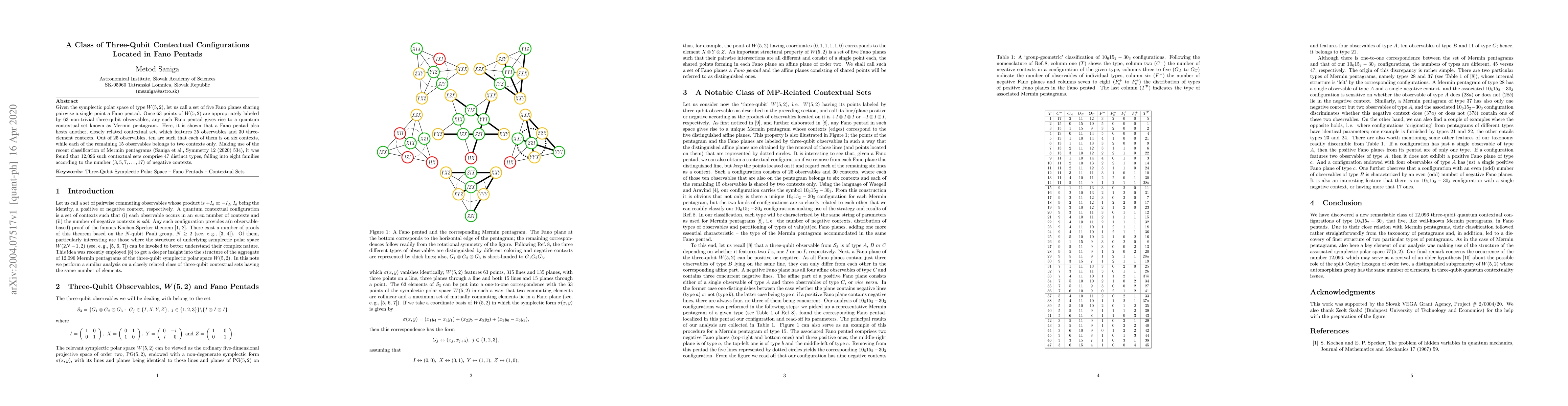 Given the symplectic polar space of type $W(5,2)$, let us call a set of five Fano planes sharing pairwise a single point a Fano pentad. Once 63 points of $W(5,2)$ are appropriately labeled by 63 non-trivial three-qubit observables, any such Fano pentad gives rise to a quantum contextual set known as Mermin pentagram. Here, it is shown that a Fano pentad also hosts another, closely related contextual set, which features 25 observables and 30 three-element contexts. Out of 25 observables, ten are such that each of them is on six contexts, while each of the remaining 15 observables belongs to two contexts only. Making use of the recent classification of Mermin pentagrams (Saniga et al., Symmetry 12 (2020) 534), it was found that 12,096 such contextual sets comprise 47 distinct types, falling into eight families according to the number ($3, 5, 7, \ldots, 17$) of negative contexts.