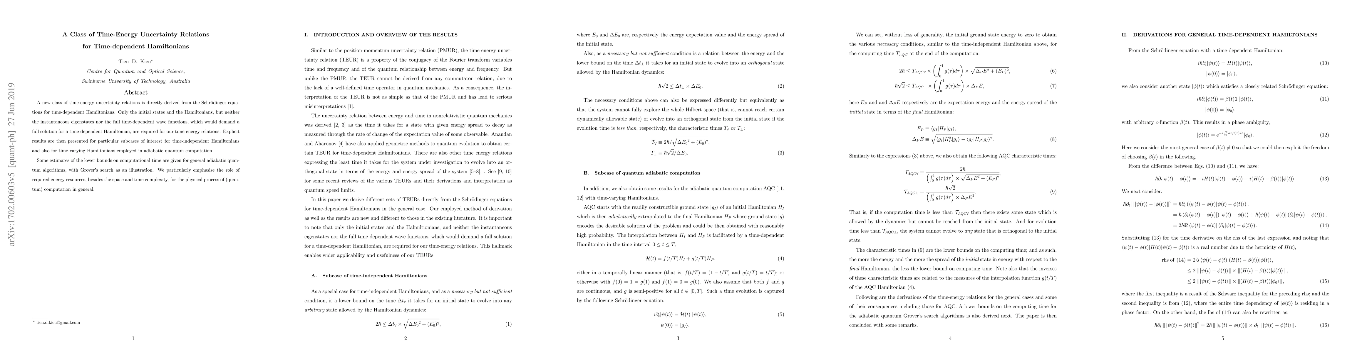 This paper develops a new class of time-energy uncertainty relations for time-dependent Hamiltonians derived from Schrödinger equations, requiring only initial states and Hamiltonians. It provides explicit results for both time-independent and time-varying Hamiltonians, including applications in adiabatic quantum computation, and discusses the energy resources needed for quantum computation.