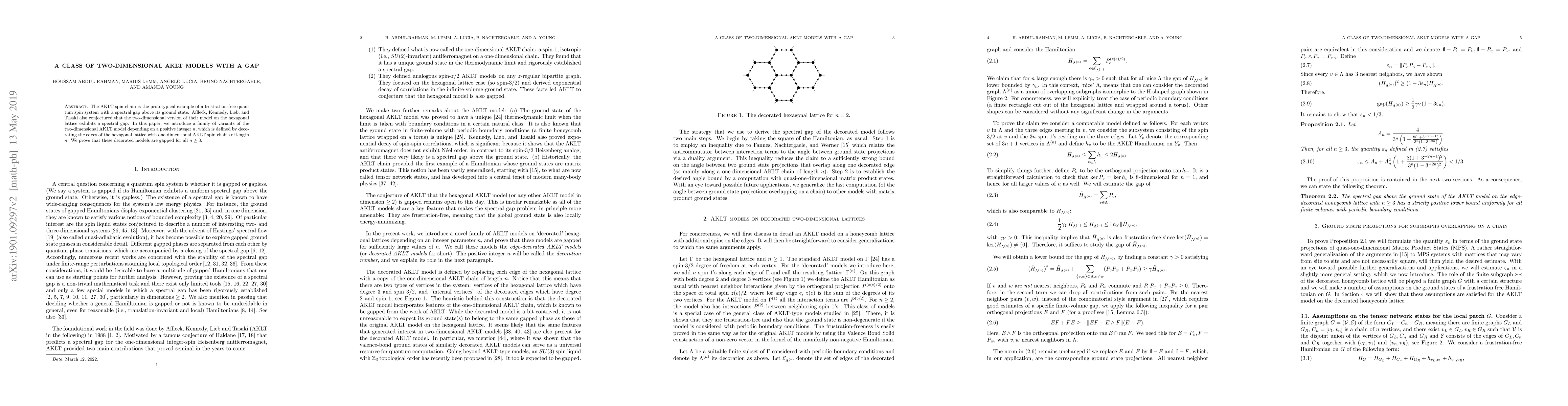 The paper introduces a family of two-dimensional AKLT model variants, decorating the edges of the hexagonal lattice with one-dimensional AKLT spin chains of length $n$, and proves their gapped nature for $n \geq 3$ using mathematical techniques including inner products, transfer operators, and spectral analysis.
