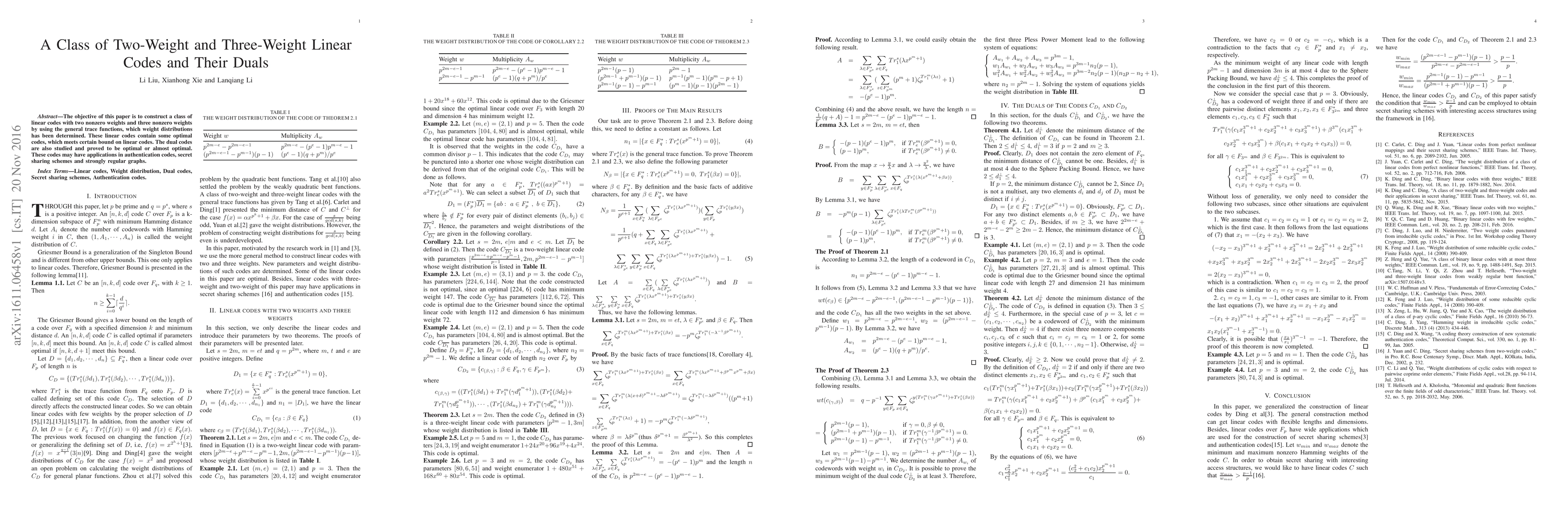 This paper constructs linear codes with two or three nonzero weights using general trace functions, determining their weight distributions. The codes meet optimal bounds and their duals are shown to be optimal or nearly optimal, with potential applications in authentication codes, secret sharing, and strongly regular graphs.