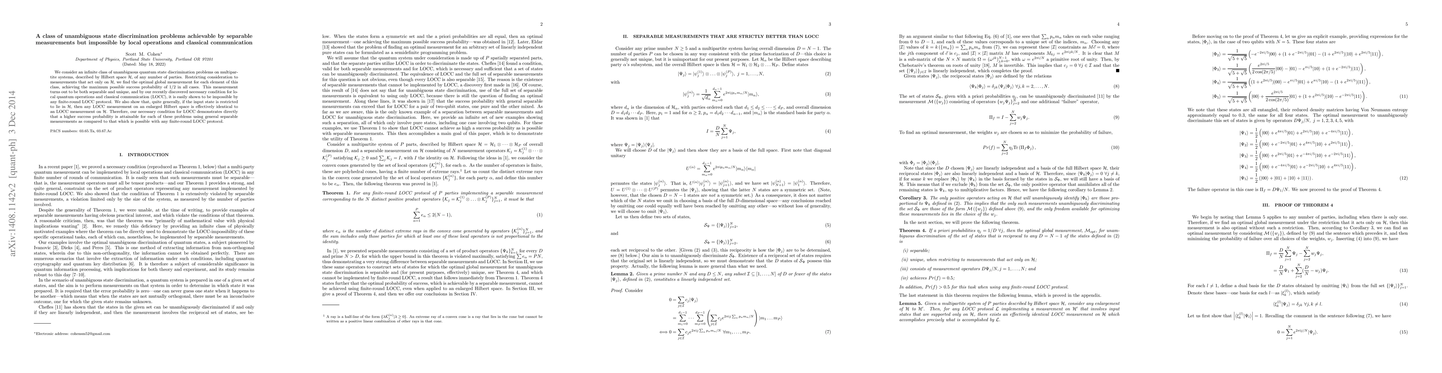 This paper explores an infinite class of unambiguous quantum state discrimination problems on multipartite systems that can be optimally solved using separable measurements, achieving a success probability of 1/2, while proving these problems are unattainable via local operations and classical communication (LOCC). The authors demonstrate that any LOCC measurement on an enlarged Hilbert space is equivalent to one on the original space, thus highlighting the superiority of separable measurements over LOCC protocols.