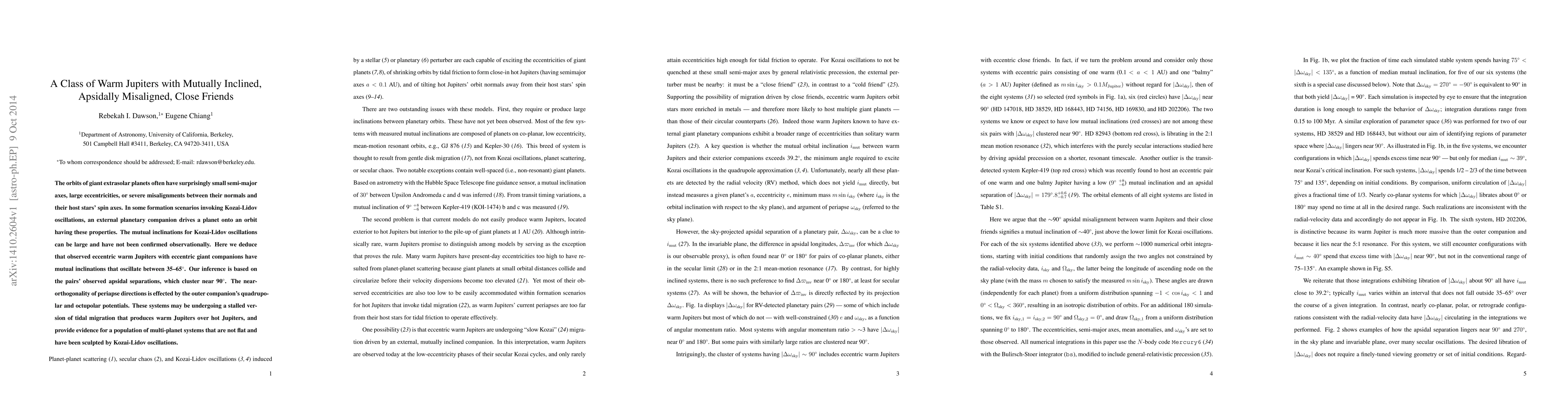The orbits of giant extrasolar planets often have surprisingly small semi-major axes, large eccentricities, or severe misalignments between their normals and their host stars' spin axes. In some formation scenarios invoking Kozai-Lidov oscillations, an external planetary companion drives a planet onto an orbit having these properties. The mutual inclinations for Kozai-Lidov oscillations can be large and have not been confirmed observationally. Here we deduce that observed eccentric warm Jupiters with eccentric giant companions have mutual inclinations that oscillate between 35-65 deg. Our inference is based on the pairs' observed apsidal separations, which cluster near 90 deg. The near-orthogonality of periapse directions is effected by the outer companion's quadrupolar and octupolar potentials. These systems may be undergoing a stalled version of tidal migration that produces warm Jupiters over hot Jupiters, and provide evidence for a population of multi-planet systems that are not flat and have been sculpted by Kozai-Lidov oscillations.