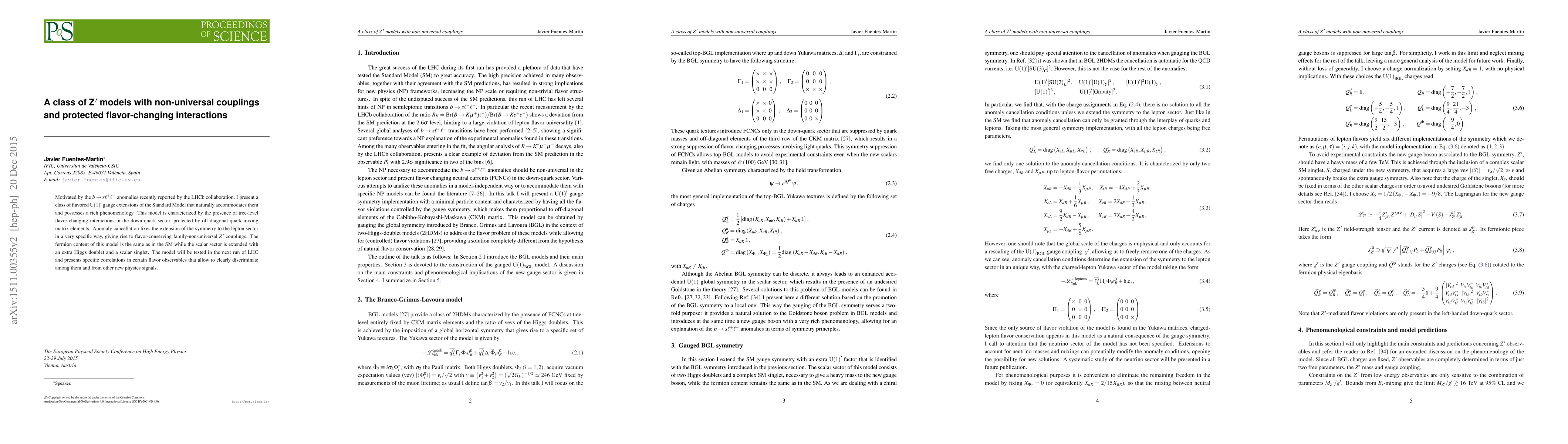 Motivated by the $b\to s\ell^+\ell^-$ anomalies recently reported by the LHCb collaboration, I present a class of flavored U(1)' gauge extensions of the Standard Model that naturally accommodates them and possesses a rich phenomenology. This model is characterized by the presence of tree-level flavor-changing interactions in the down-quark sector, protected by off-diagonal quark-mixing matrix elements. Anomaly cancellation fixes the extension of the symmetry to the lepton sector in a very specific way, giving rise to flavor-conserving family-non-universal Z' couplings. The fermion content of this model is the same as in the SM while the scalar sector is extended with an extra Higgs doublet and a scalar singlet. The model will be tested in the next run of LHC and presents specific correlations in certain flavor observables that allow to clearly discriminate among them and from other new physics signals.