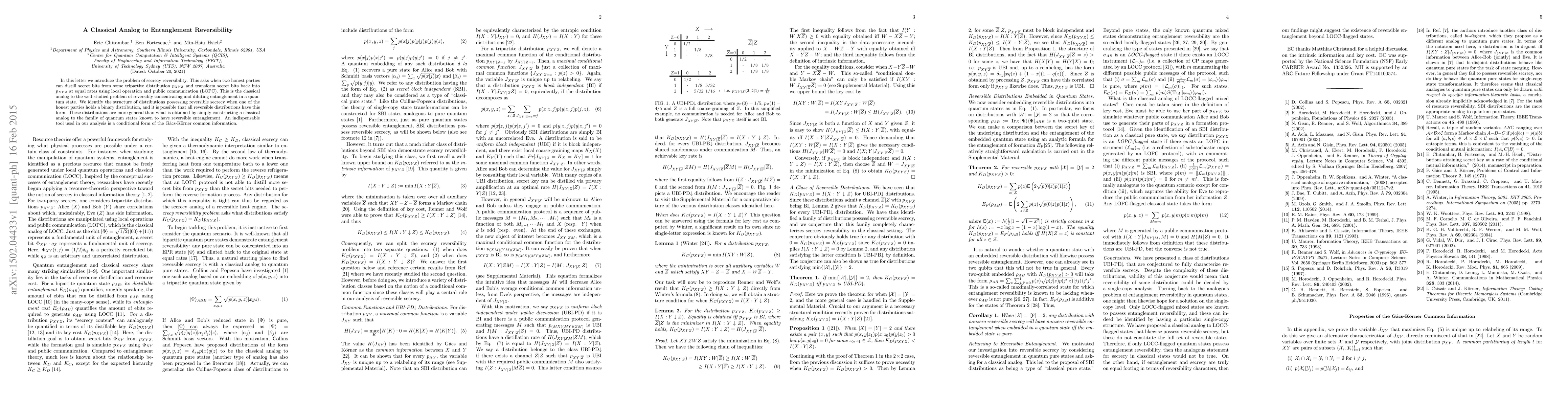 Researchers investigate classical analogs to entanglement reversibility, focusing on conditions for secrecy reversibility in tripartite distributions. They identify a structure of distributions that can distill secret bits back into their original form at equal rates using local operations and public communication.