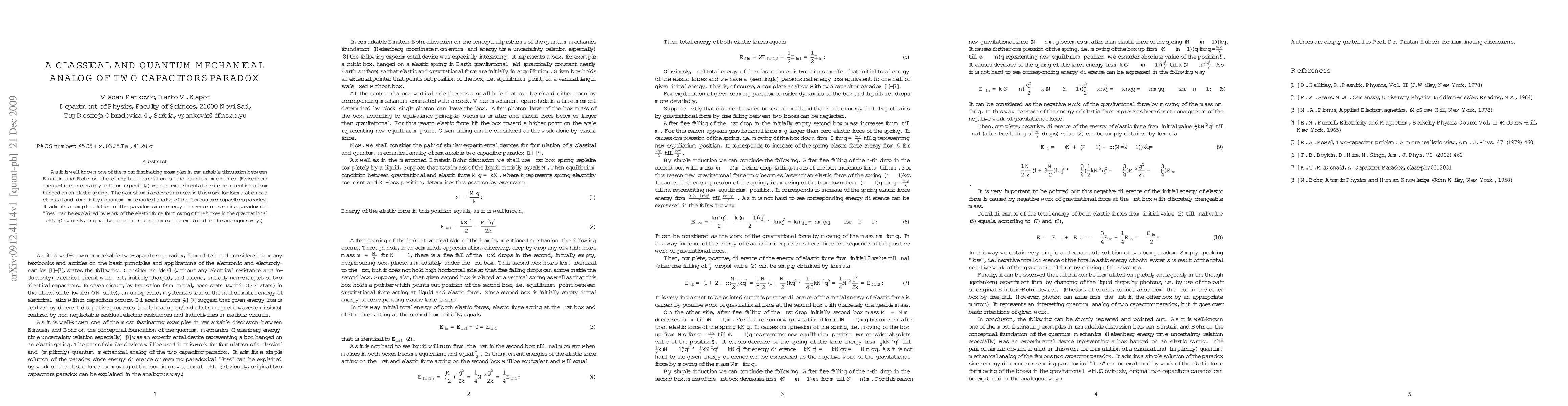 This paper explores a classical and quantum mechanical analog of the two capacitors paradox using a pair of boxes on elastic springs, resolving the paradox by attributing the energy difference to the work done by the elastic force in a gravitational field. The study draws parallels to the Heisenberg energy-time uncertainty relation in the context of the Einstein-Bohr debate.