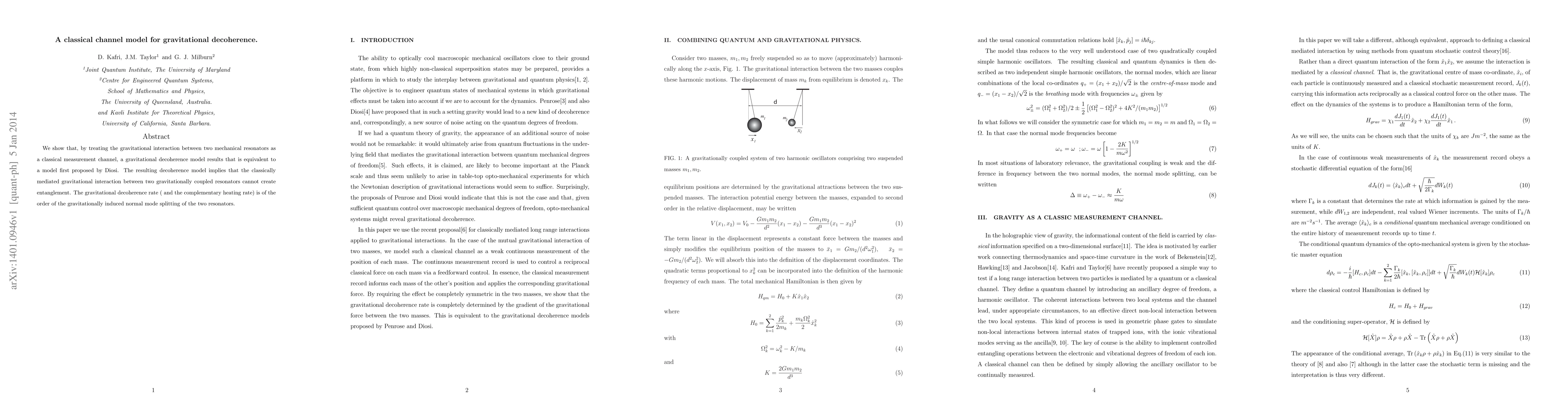 This paper shows that gravitational decoherence can be modeled as a classical measurement channel, leading to a model that implies gravitationally coupled resonators cannot create entanglement. The result suggests the gravitational decoherence rate is similar to the normal mode splitting of the two resonators.
