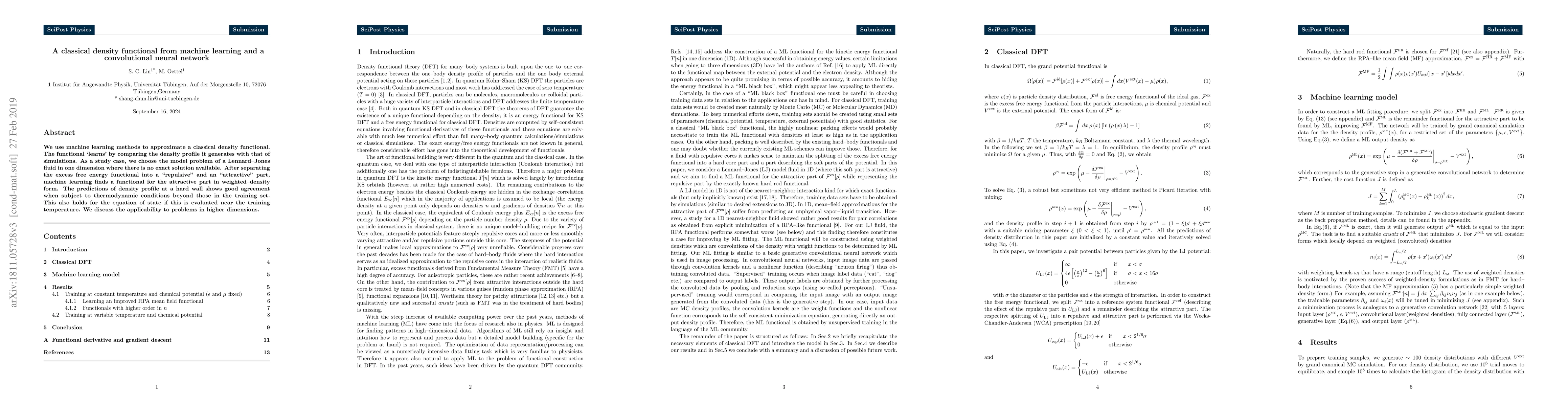 This research uses machine learning, specifically a convolutional neural network, to approximate a classical density functional for a Lennard-Jones fluid in one dimension, where no exact solution exists. The method successfully separates the excess free energy into repulsive and attractive parts, finding a weighted density form for the attractive part. The approach accurately predicts density profiles at hard walls and equations of state near training temperature, suggesting potential for higher-dimensional problems.