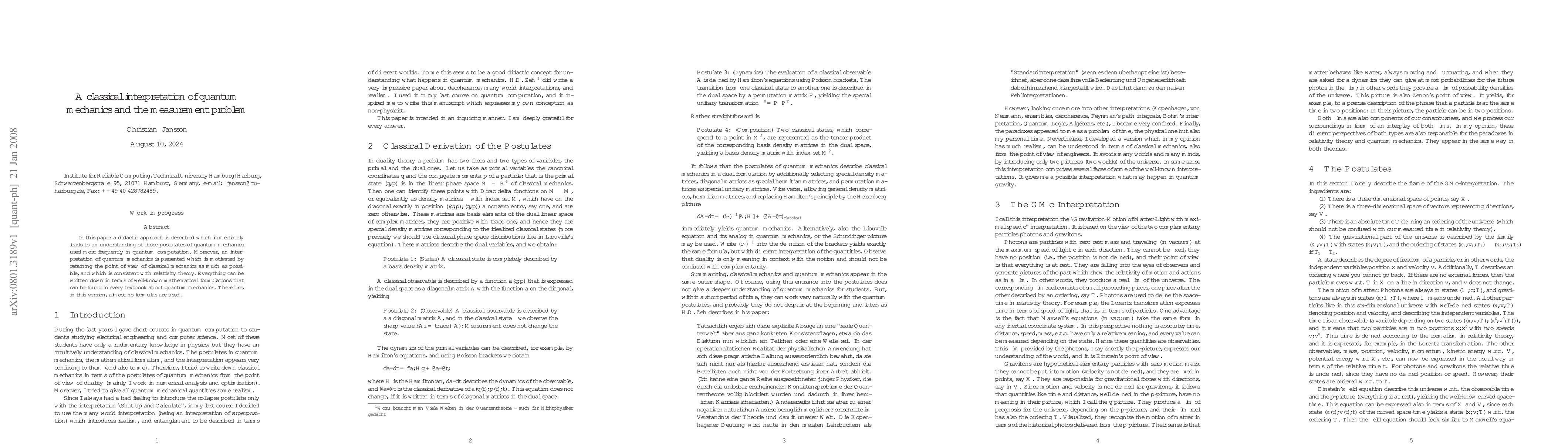 In this paper a didactic approach is described which immediately leads to an understanding of those postulates of quantum mechanics used most frequently in quantum computation. Moreover, an interpretation of quantum mechanics is presented which is motivated by retaining the point of view of classical mechanics as much as possible, and which is consistent with relativity theory. Everything can be written down in terms of well-known mathematical formulations that can be found in every textbook about quantum mechanics. Therefore, in this version, almost no formulas are used.