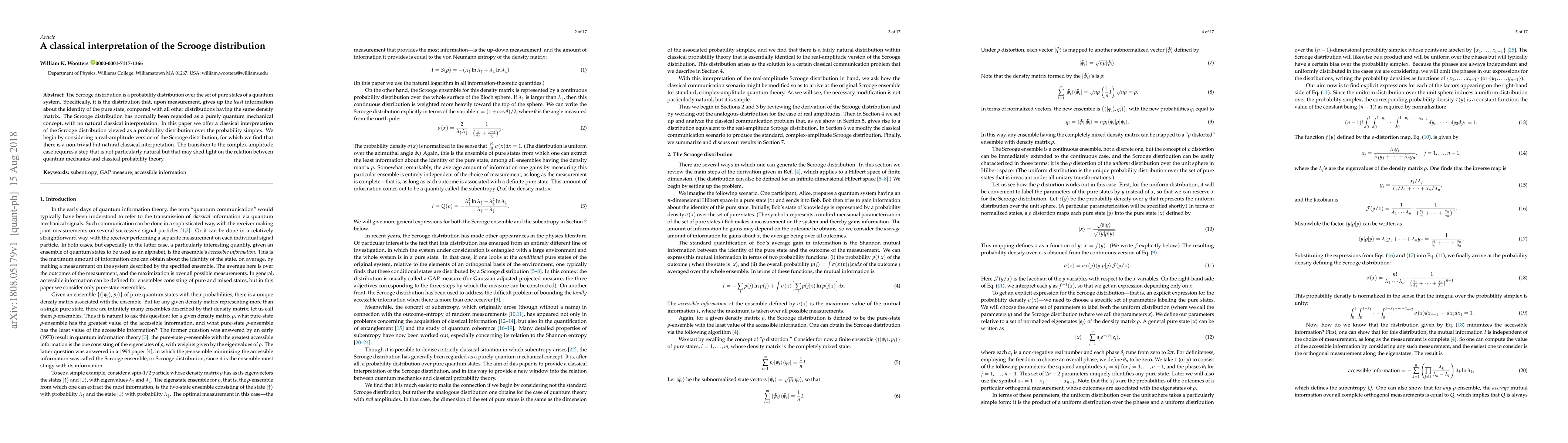 The Scrooge distribution is a probability distribution over the set of pure states of a quantum system. Specifically, it is the distribution that, upon measurement, gives up the least information about the identity of the pure state, compared with all other distributions having the same density matrix. The Scrooge distribution has normally been regarded as a purely quantum mechanical concept, with no natural classical interpretation. In this paper we offer a classical interpretation of the Scrooge distribution viewed as a probability distribution over the probability simplex. We begin by considering a real-amplitude version of the Scrooge distribution, for which we find that there is a non-trivial but natural classical interpretation. The transition to the complex-amplitude case requires a step that is not particularly natural but that may shed light on the relation between quantum mechanics and classical probability theory.
