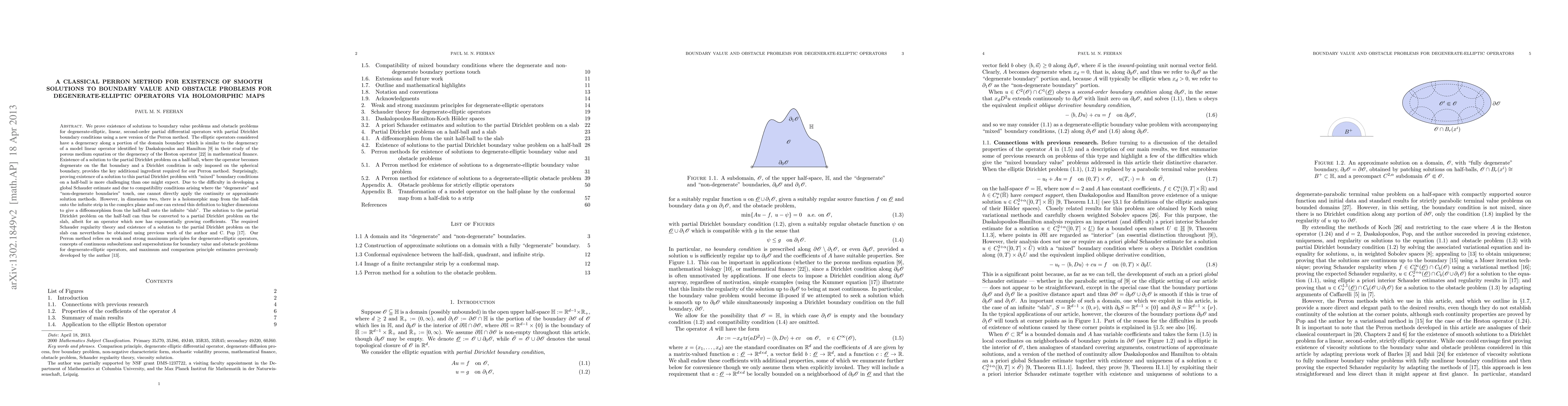 This paper proves the existence of smooth solutions to boundary value and obstacle problems for degenerate-elliptic operators using a novel Perron method. The method leverages a solution to the Dirichlet problem on a half-ball and employs holomorphic maps to extend results to an infinite slab, relying on Schauder regularity theory and previous work on maximum principles.