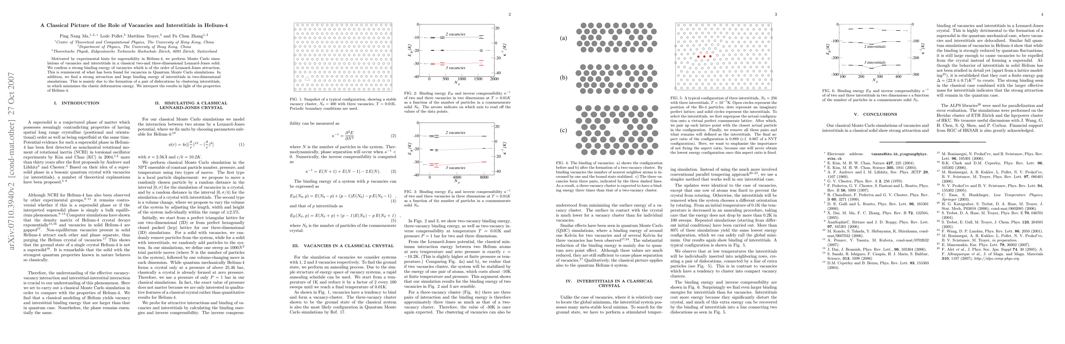 Motivated by experimental hints for supersolidity in Helium-4, we perform Monte Carlo simulations of vacancies and interstitials in a classical two-and three-dimensional Lennard-Jones solid. We confirm a strong binding energy of vacancies which is of the order of Lennard-Jones attraction. This is reminiscent of what has been found for vacancies in Quantum Monte Carlo simulations. In addition, we find a strong attraction and large binding energy of interstitials in two-dimensional simulations. This is mainly due to the formation of a pair of dislocations by clustering interstitials, in which minimizes the elastic deformation energy. We interpret the results in light of the properties of Helium-4.