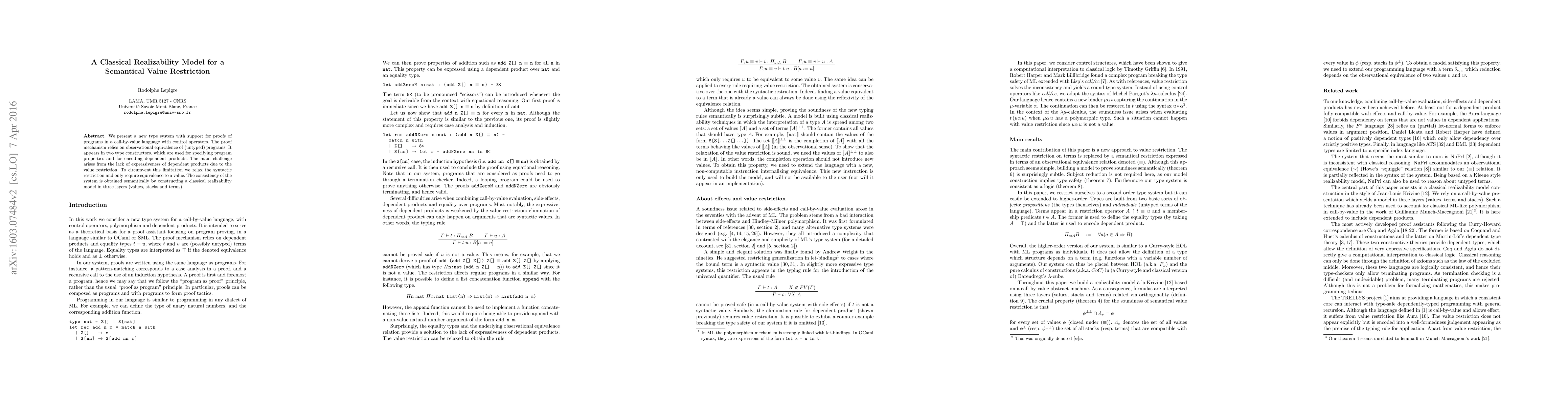 This paper introduces a novel type system for call-by-value languages with control operators, leveraging observational equivalence and addressing the value restriction issue with a syntactic relaxation. It constructs a classical realizability model across three layers for semantic consistency.