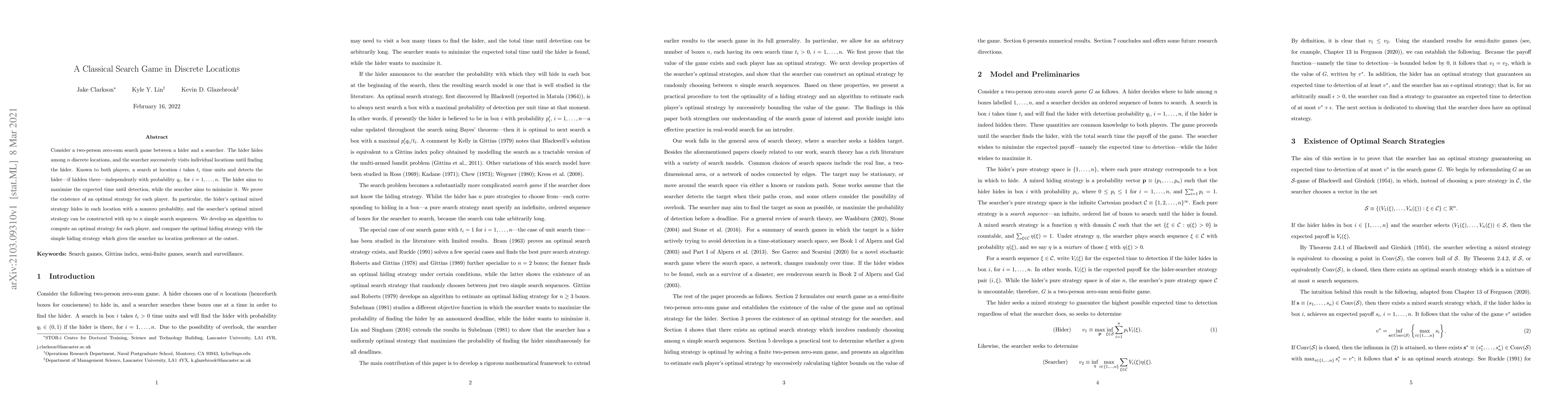 This paper studies a two-player search game where a hider aims to maximize detection time and a searcher aims to minimize it, given discrete locations with varying search times and detection probabilities. The authors prove the existence of optimal strategies for both players and develop an algorithm to compute these strategies.
