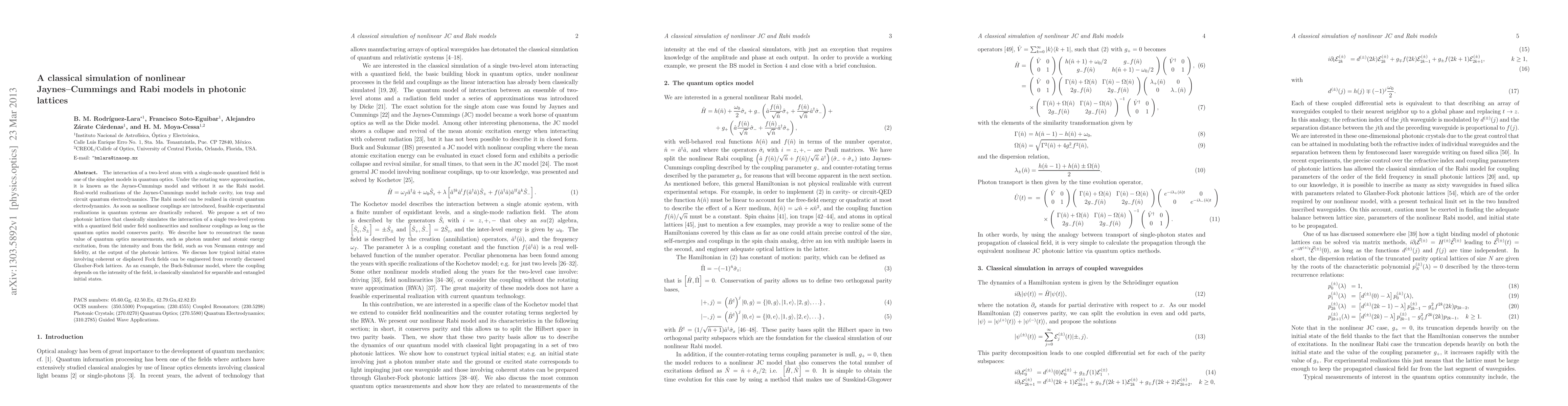 This paper proposes a classical simulation of nonlinear Jaynes-Cummings and Rabi models using photonic lattices, enabling the reconstruction of quantum optics measurements like photon number and atomic energy excitation. It demonstrates the simulation of the Buck-Sukumar model for both separable and entangled initial states.