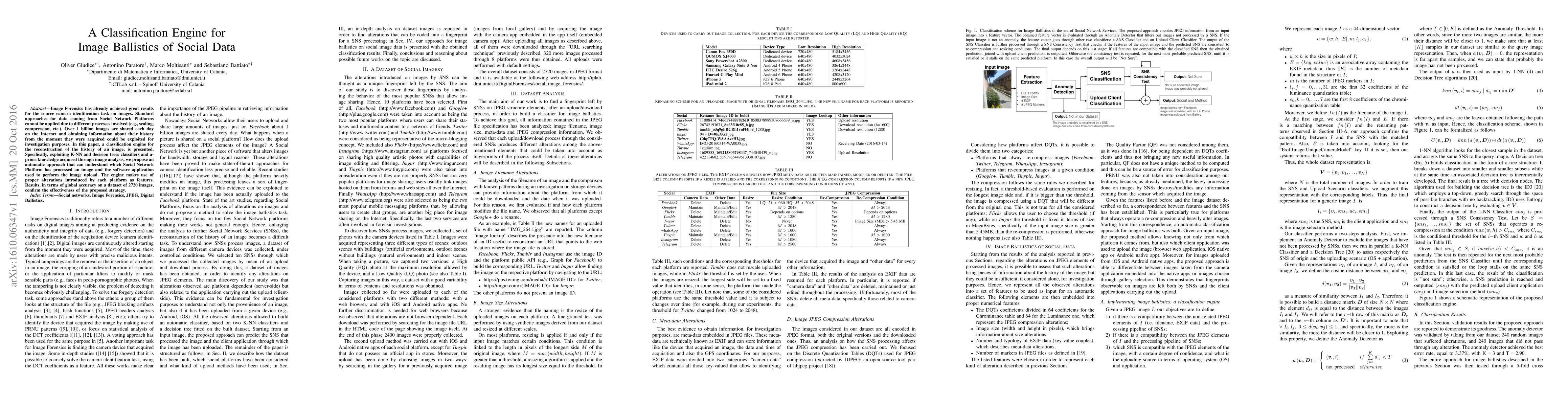 This paper introduces a classification engine to trace the history of images shared on social networks, identifying the platform and upload software used. It employs K-NN and decision trees, utilizing unique alterations each platform makes as features, achieving high accuracy with 2720 test images.