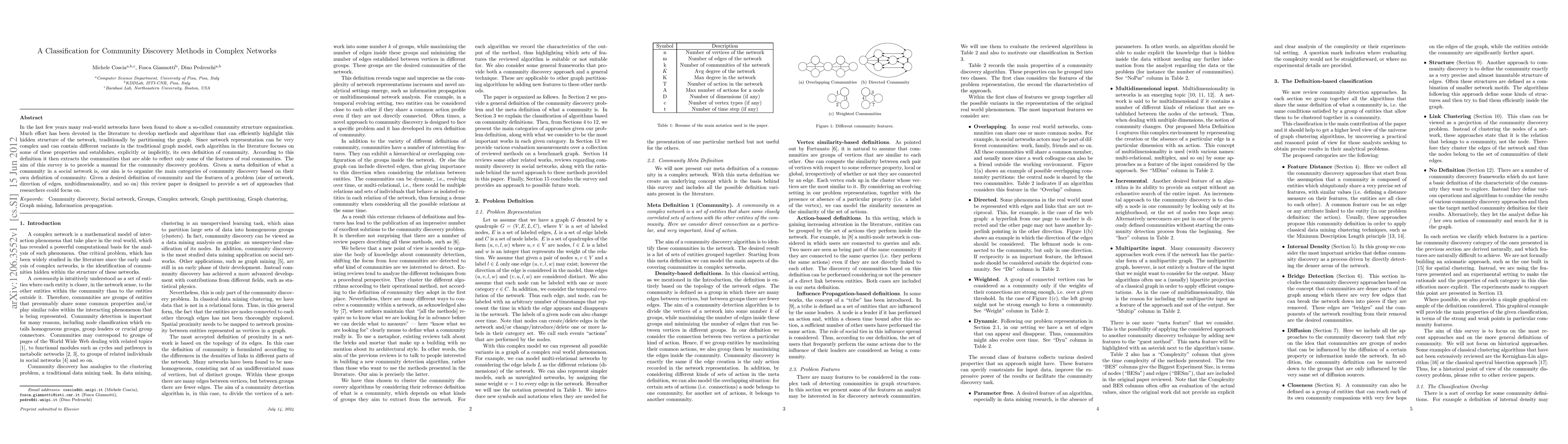 This paper surveys various community discovery methods for complex networks, categorizing them based on their definitions of community and the network properties they consider. It aims to guide researchers in selecting appropriate approaches based on their specific network characteristics and desired community definitions.