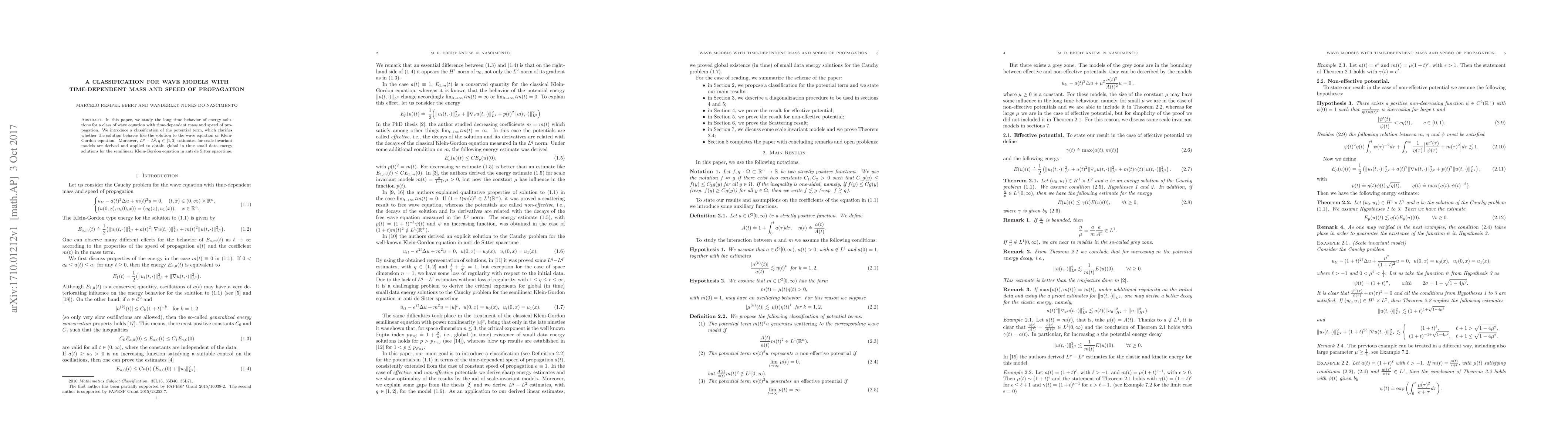 This paper classifies wave models with time-dependent mass and speed of propagation, determining their long-time behavior and comparing them to solutions of the wave and Klein-Gordon equations. It also derives $L^q-L^2$ estimates for scale-invariant models to find global small data energy solutions for the semilinear Klein-Gordon equation in anti de Sitter spacetime.