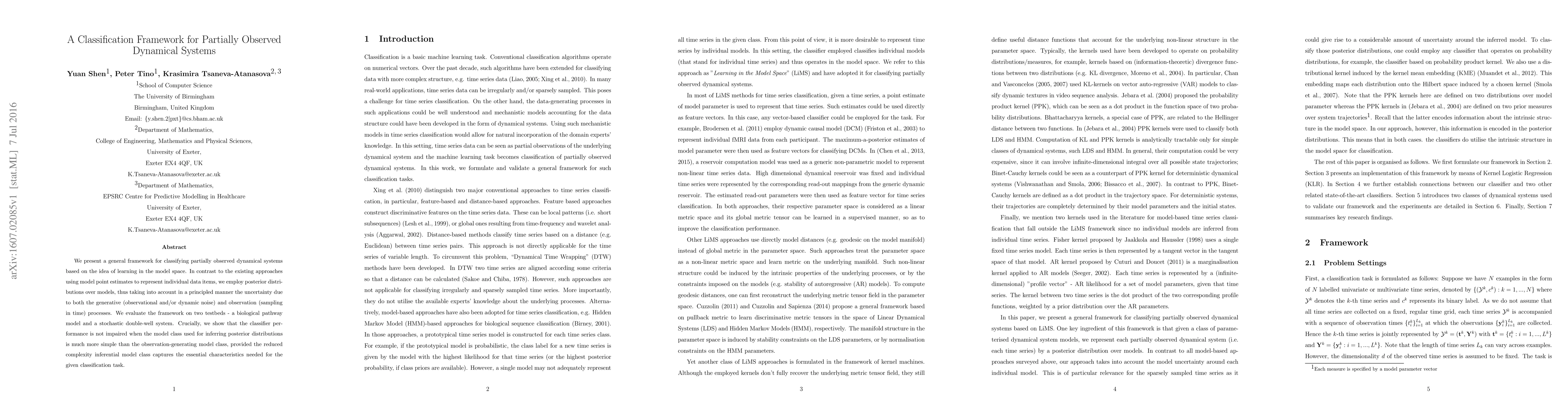 We present a general framework for classifying partially observed dynamical systems based on the idea of learning in the model space. In contrast to the existing approaches using model point estimates to represent individual data items, we employ posterior distributions over models, thus taking into account in a principled manner the uncertainty due to both the generative (observational and/or dynamic noise) and observation (sampling in time) processes. We evaluate the framework on two testbeds - a biological pathway model and a stochastic double-well system. Crucially, we show that the classifier performance is not impaired when the model class used for inferring posterior distributions is much more simple than the observation-generating model class, provided the reduced complexity inferential model class captures the essential characteristics needed for the given classification task.