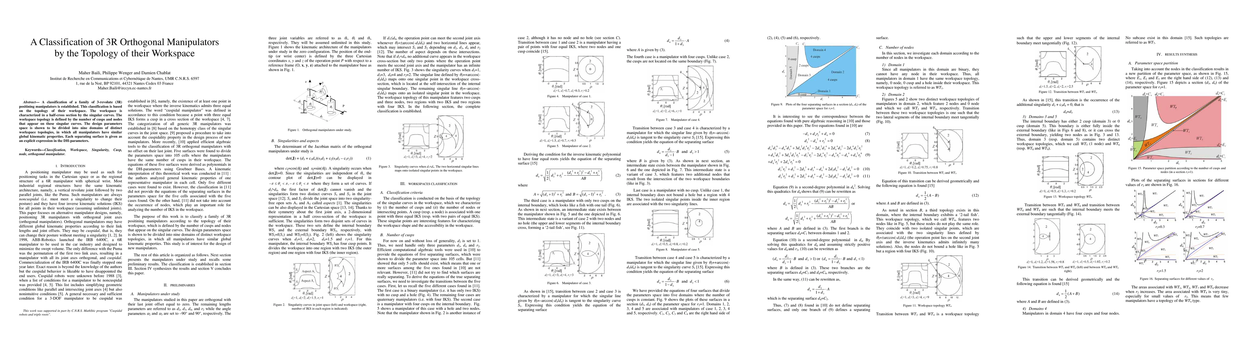 A classification of a family of 3-revolute (3R) positining manipulators is established. This classification is based on the topology of their workspace. The workspace is characterized in a half-cross section by the singular curves. The workspace topology is defined by the number of cusps and nodes that appear on these singular curves. The design parameters space is shown to be divided into nine domains of distinct workspace topologies, in which all manipulators have similar global kinematic properties. Each separating surface is given as an explicit expression in the DH-parameters.