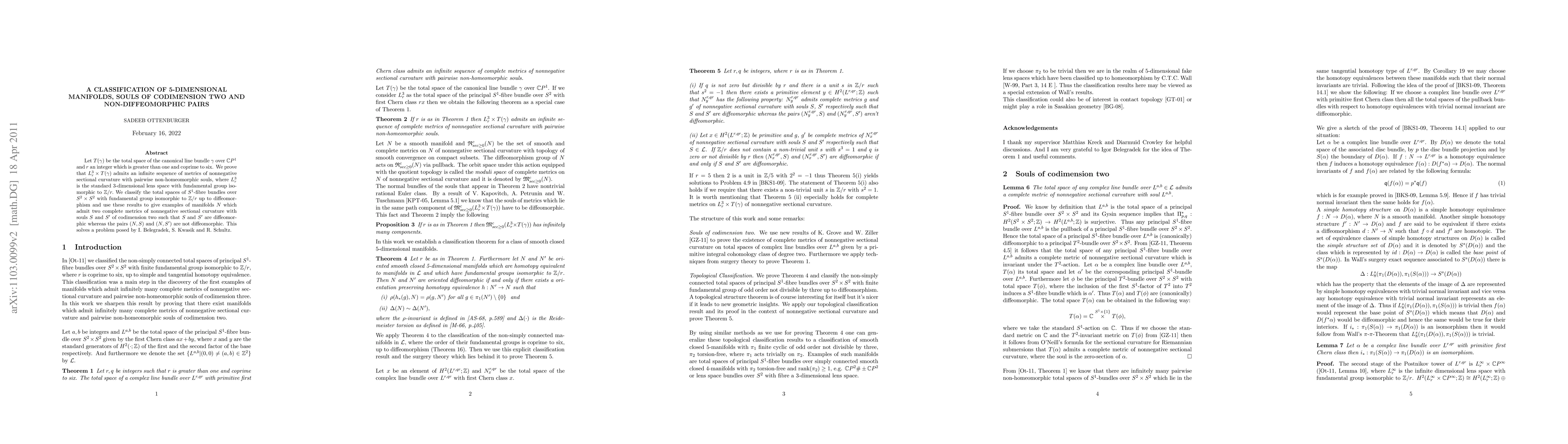The paper introduces a classification of certain 5-dimensional manifolds using advanced concepts from algebraic topology and differential geometry, specifically focusing on souls and nonnegative curvature properties.