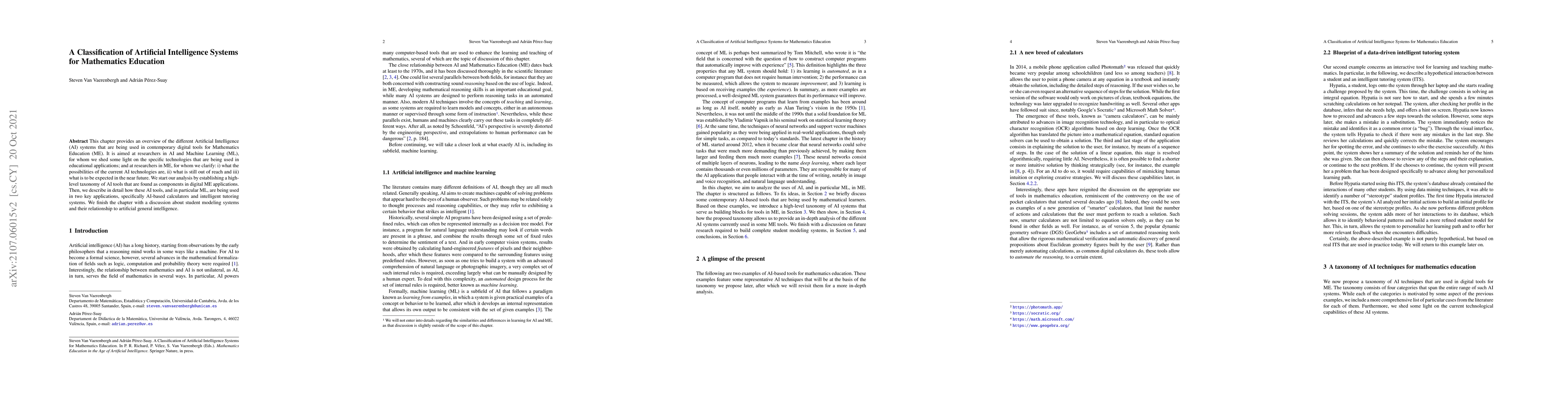 This chapter provides an overview of the different Artificial Intelligence (AI) systems that are being used in contemporary digital tools for Mathematics Education (ME). It is aimed at researchers in AI and Machine Learning (ML), for whom we shed some light on the specific technologies that are being used in educational applications; and at researchers in ME, for whom we clarify: i) what the possibilities of the current AI technologies are, ii) what is still out of reach and iii) what is to be expected in the near future. We start our analysis by establishing a high-level taxonomy of AI tools that are found as components in digital ME applications. Then, we describe in detail how these AI tools, and in particular ML, are being used in two key applications, specifically AI-based calculators and intelligent tutoring systems. We finish the chapter with a discussion about student modeling systems and their relationship to artificial general intelligence.