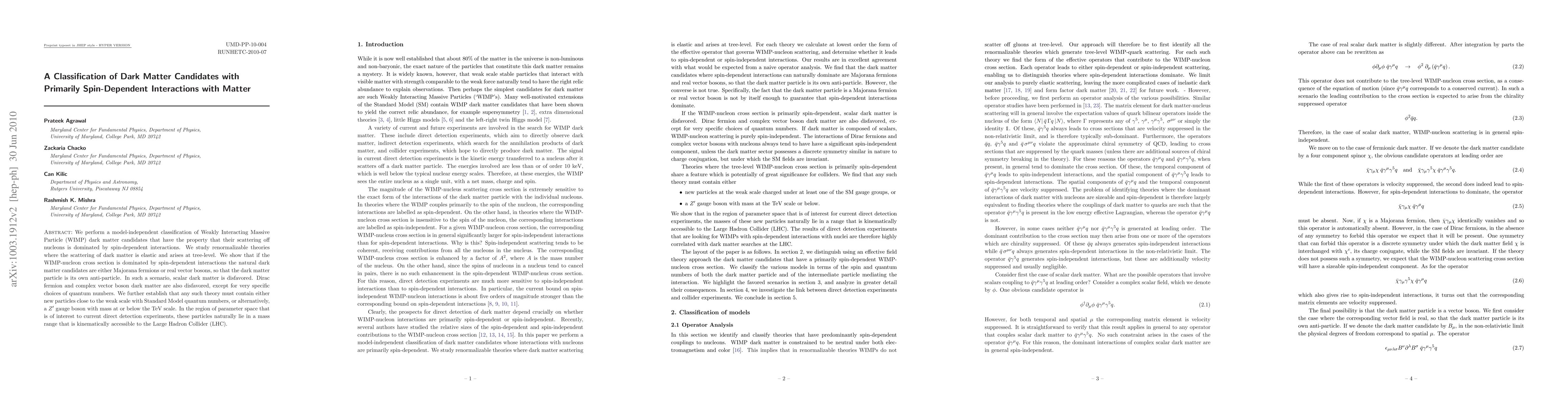 This paper classifies WIMP dark matter candidates with spin-dependent interactions, finding that Majorana fermions or real vector bosons are the most likely candidates. It also concludes that scalar, Dirac fermion, and complex vector boson dark matter are disfavored, except under specific conditions.