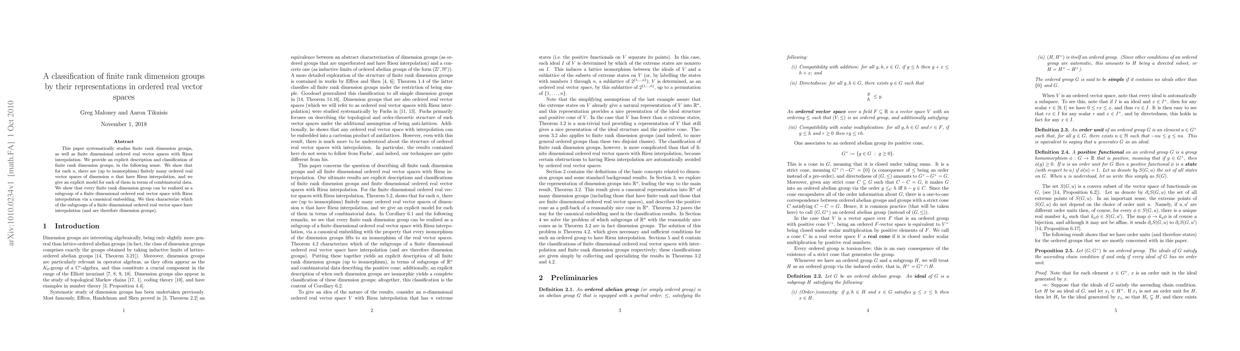 This paper classifies finite rank dimension groups by their representations in ordered real vector spaces with Riesz interpolation, showing that each dimension group can be embedded in a finite-dimensional vector space with an explicit combinatorial model. It also characterizes which subgroups of these vector spaces maintain Riesz interpolation.