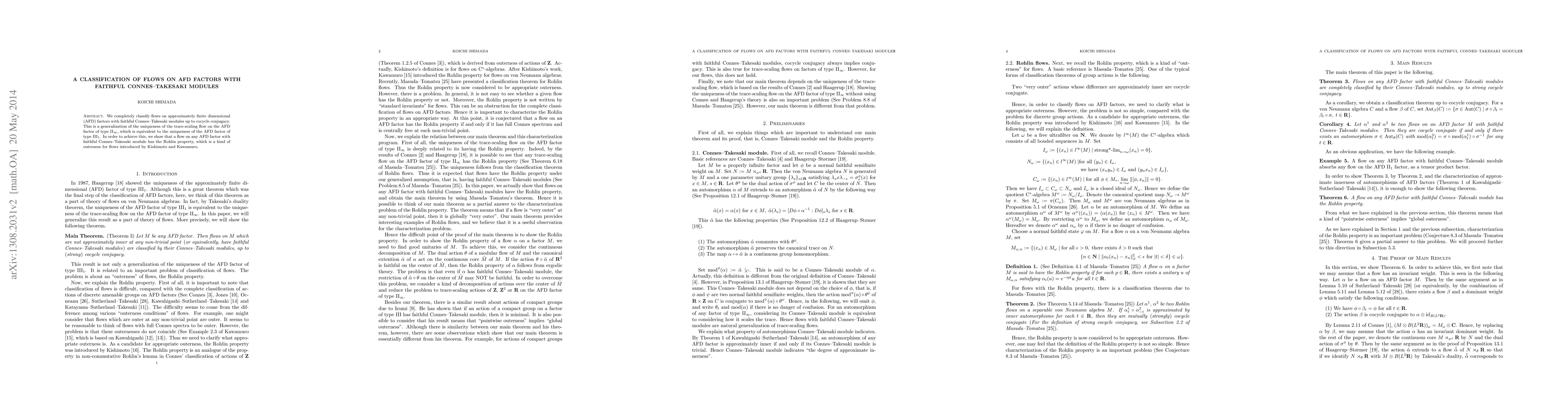 Researchers classify flows on AFD factors with faithful Connes-Takesaki modules, showing that such flows have the Rohlin property, which enables a generalization of classification results in the field of von Neumann algebra.