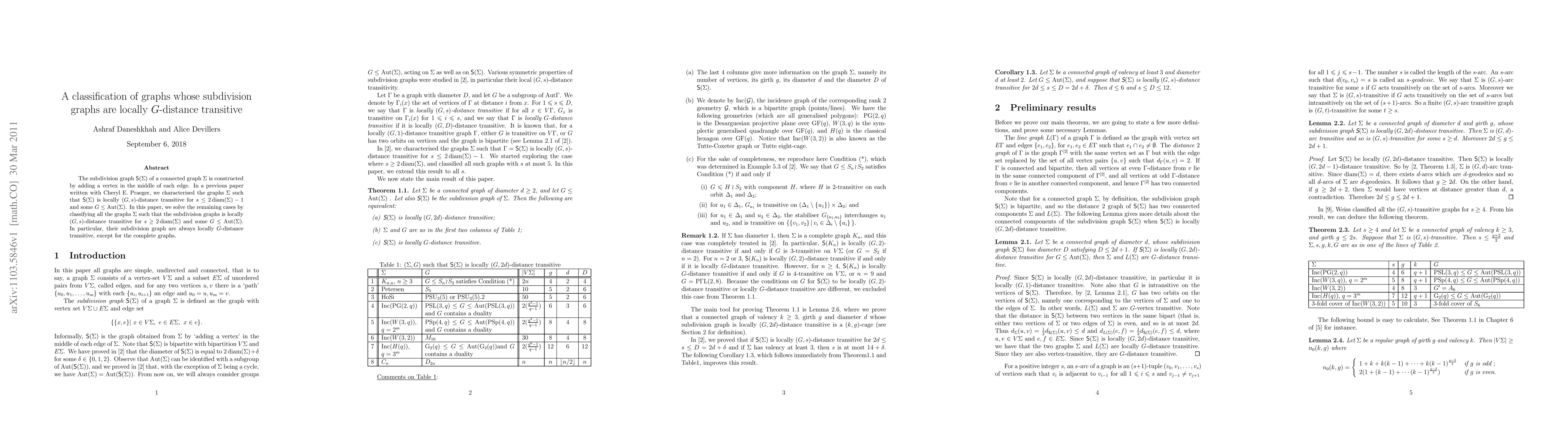 This paper classifies connected graphs whose subdivision graphs exhibit local $(G,s)$-distance transitivity for $s \geq 2 \, \text{diam}(\Sigma)$ under automorphisms $G \leq \text{Aut}(\Sigma)$, with a notable exception for complete graphs.