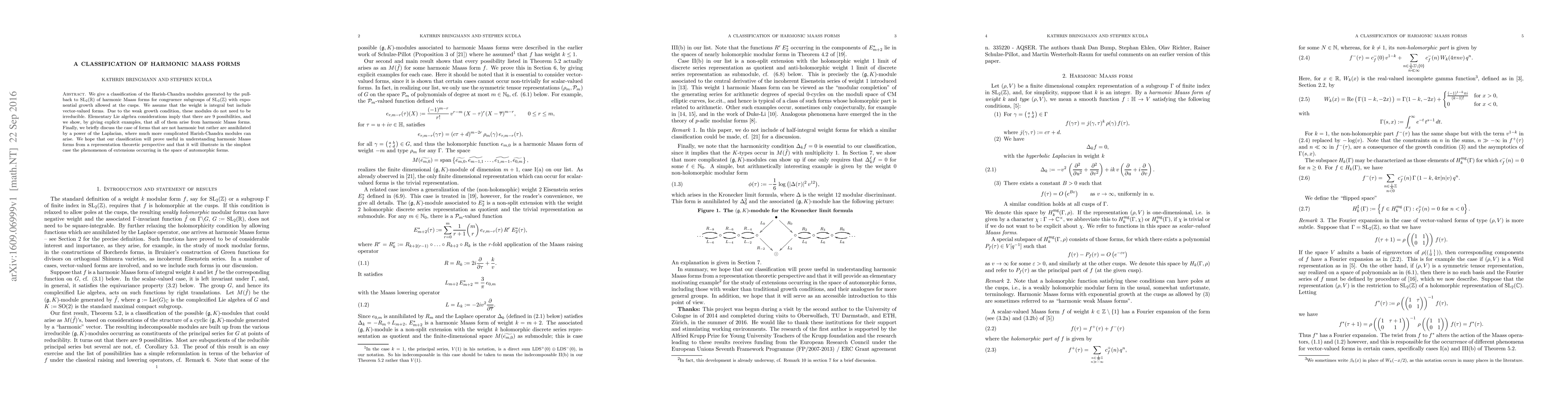 We give a classification of the Harish-Chandra modules generated by the pullback to $\text{SL}_2(\mathbb R)$ of harmonic Maass forms for congruence subgroups of $\text{SL}_2(\mathbb Z)$ with exponential growth allowed at the cusps. We assume that the weight is integral but include vector-valued forms. Due to the weak growth condition, these modules need not be irreducible. Elementary Lie algebra considerations imply that there are 9 possibilities, and we show, by giving explicit examples, that all of them arise from harmonic Maass forms. Finally, we briefly discuss the case of forms that are not harmonic but rather are annihilated by a power of the Laplacian, where much more complicated Harish-Chandra modules can arise.