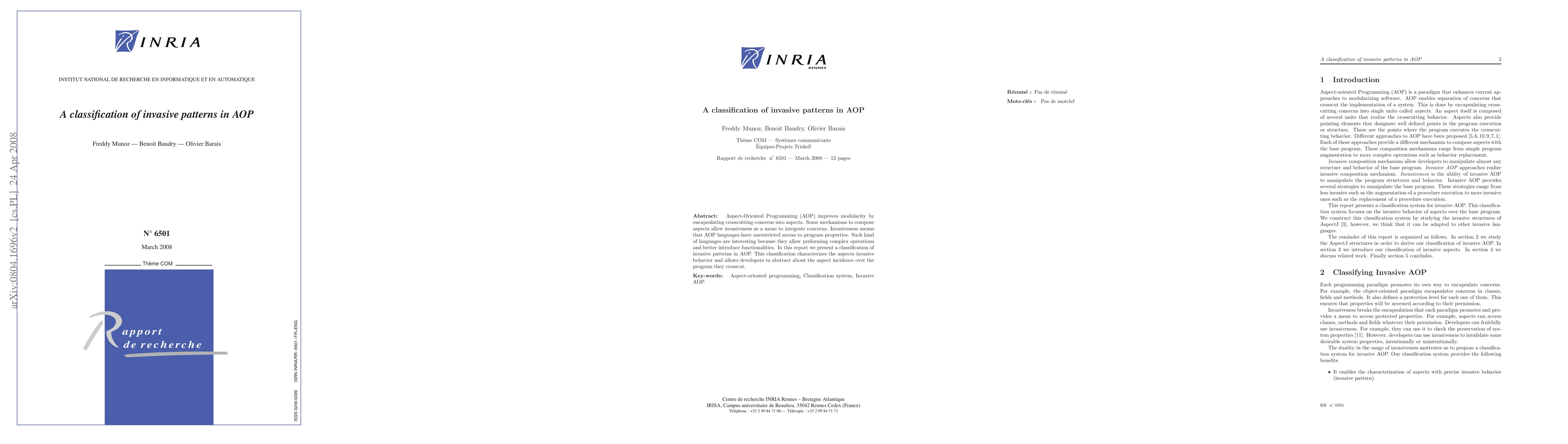 Aspect-Oriented Programming (AOP) improves modularity by encapsulating crosscutting concerns into aspects. Some mechanisms to compose aspects allow invasiveness as a mean to integrate concerns. Invasiveness means that AOP languages have unrestricted access to program properties. Such kind of languages are interesting because they allow performing complex operations and better introduce functionalities. In this report we present a classification of invasive patterns in AOP. This classification characterizes the aspects invasive behavior and allows developers to abstract about the aspect incidence over the program they crosscut.