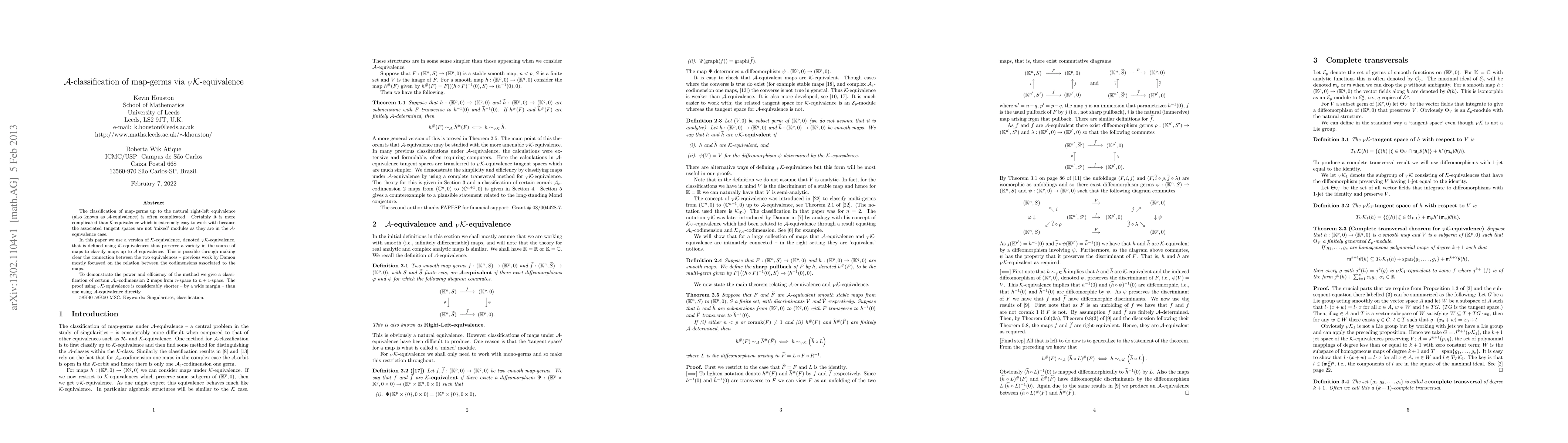 This paper proposes using $_V$K-equivalence, a modified version of K-equivalence, to classify map-germs up to A-equivalence by preserving specific varieties in the map's source. It demonstrates the method's efficiency by providing a shorter classification proof for certain A$_e$-codimension 2 maps from $n$-space to $n+1$-space compared to direct A-equivalence methods.